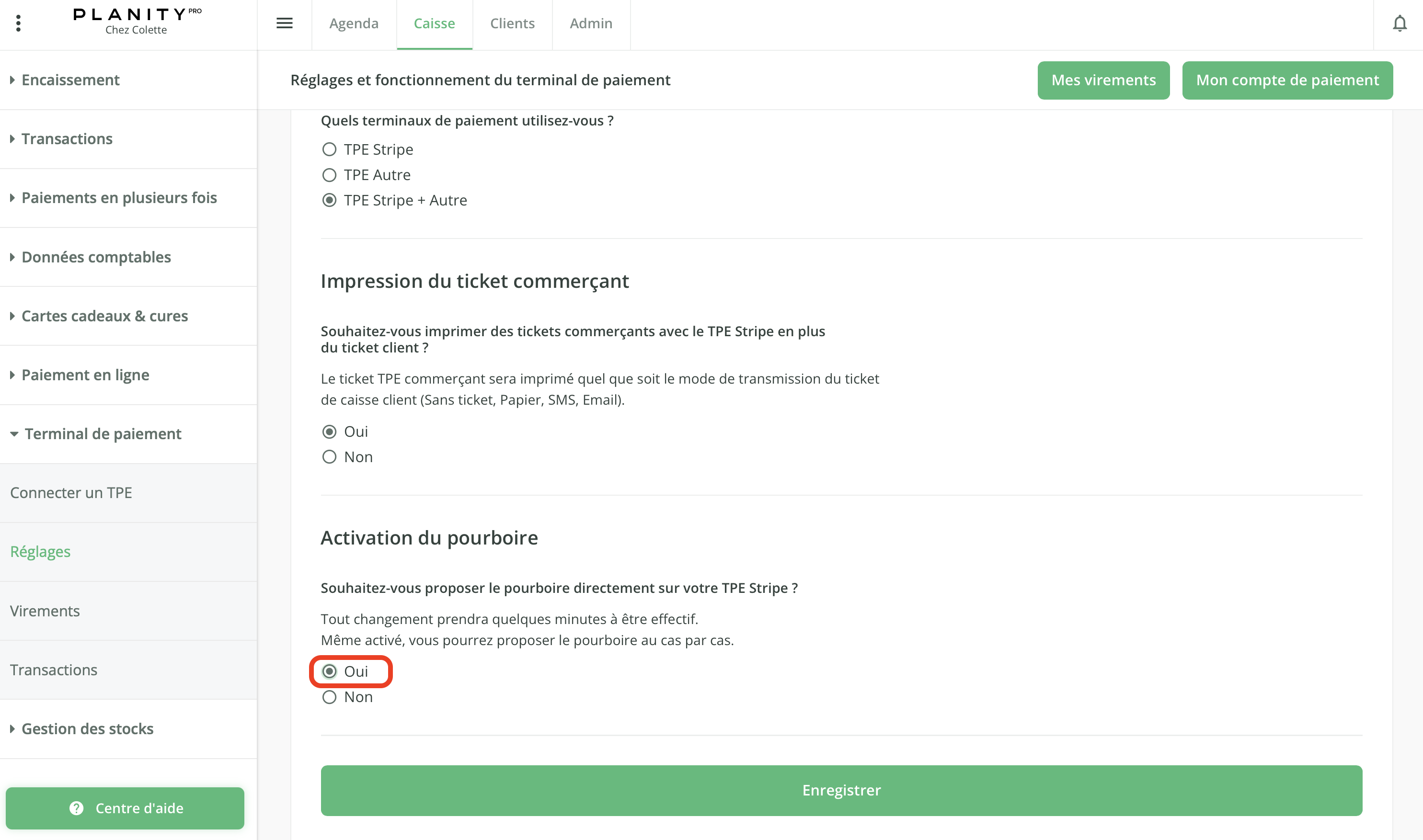 - Sur cette page, descendez jusqu'à la partie "Activation du pourboire" puis à la question "Souhaitez-vous proposer le pourboire directement sur votre TPE Stripe", cliquez sur "Oui". N'oubliez pas d'enregistrer pour rendre effectif votre changement.