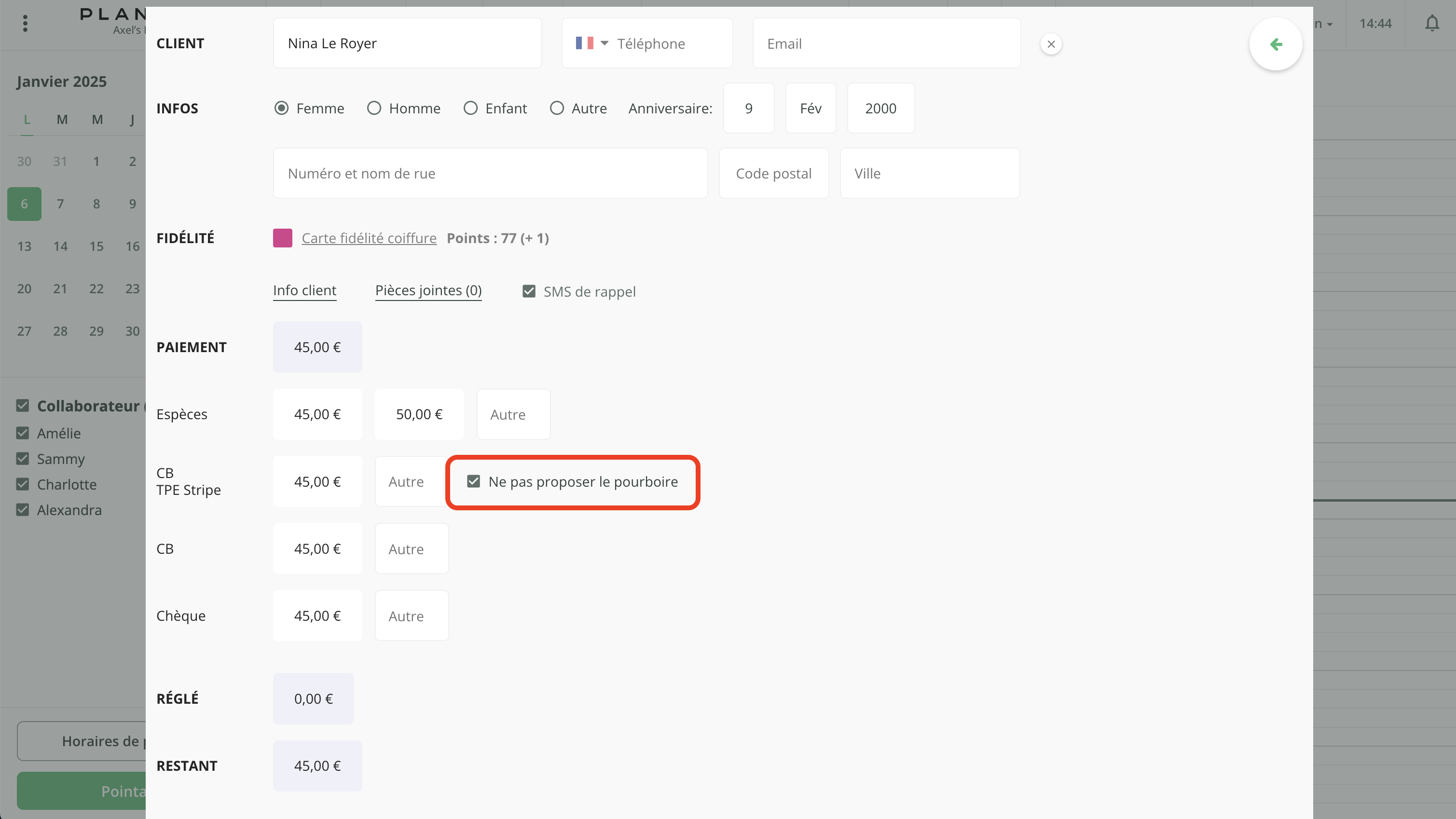 - (Optionnel) Si vous ne souhaitez pas demander de pourboire vous pouvez aussi client par client décocher la case ne pas proposer le pourboire au moment de l'encaissement.