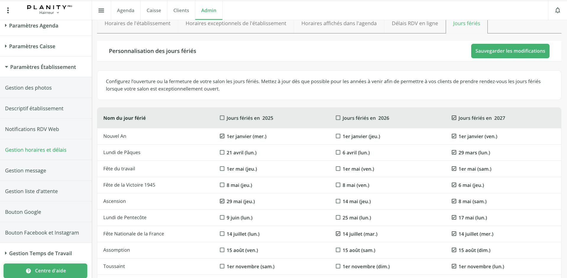 - Puis cliquez sur le bouton Sauvegarder les modifications. Vos jours sélectionnés ne seront plus accessibles à la réservation sur Planity.com