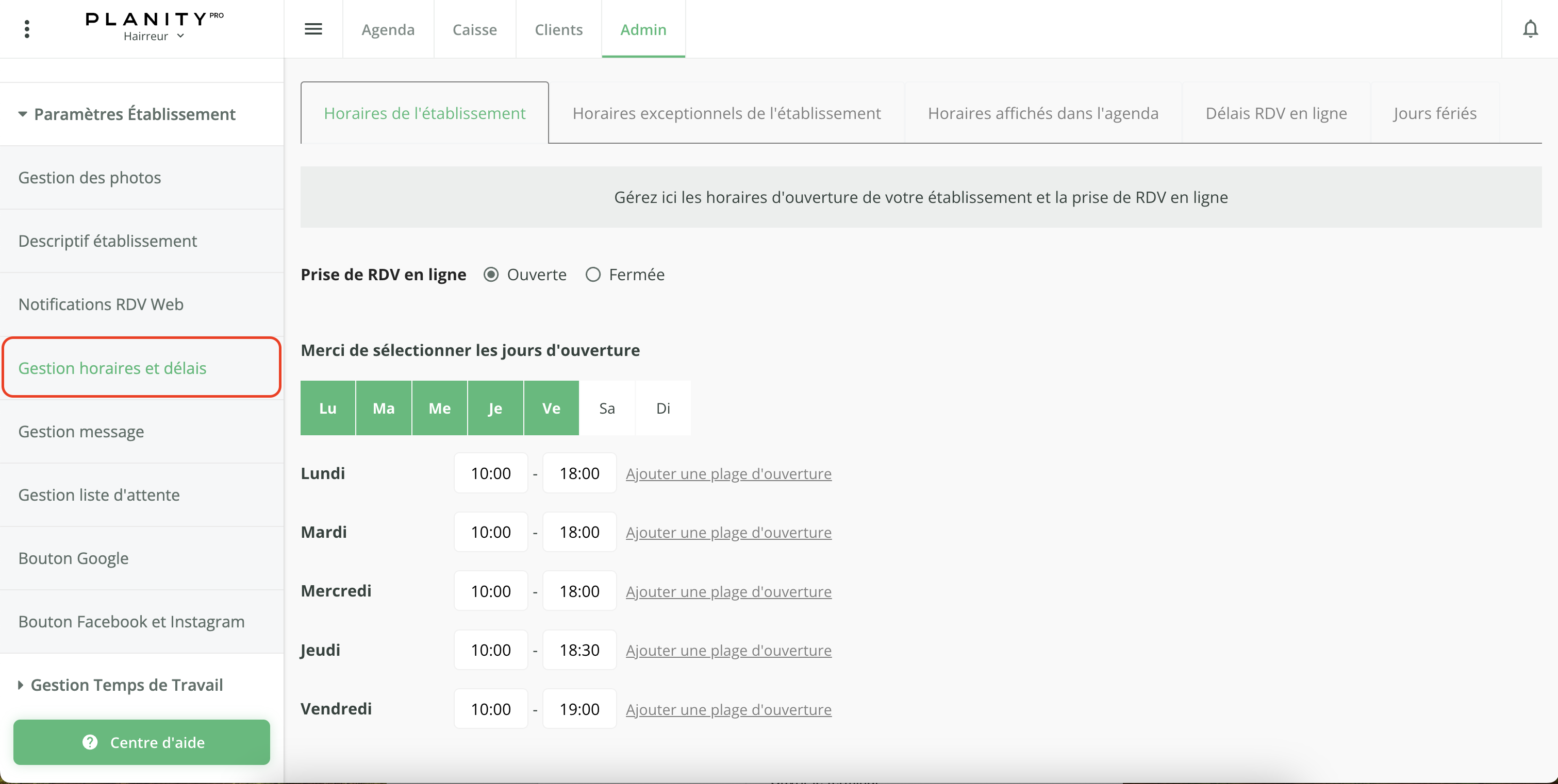 - Cliquez sur le sous-menu "Gestion horaires et délais"