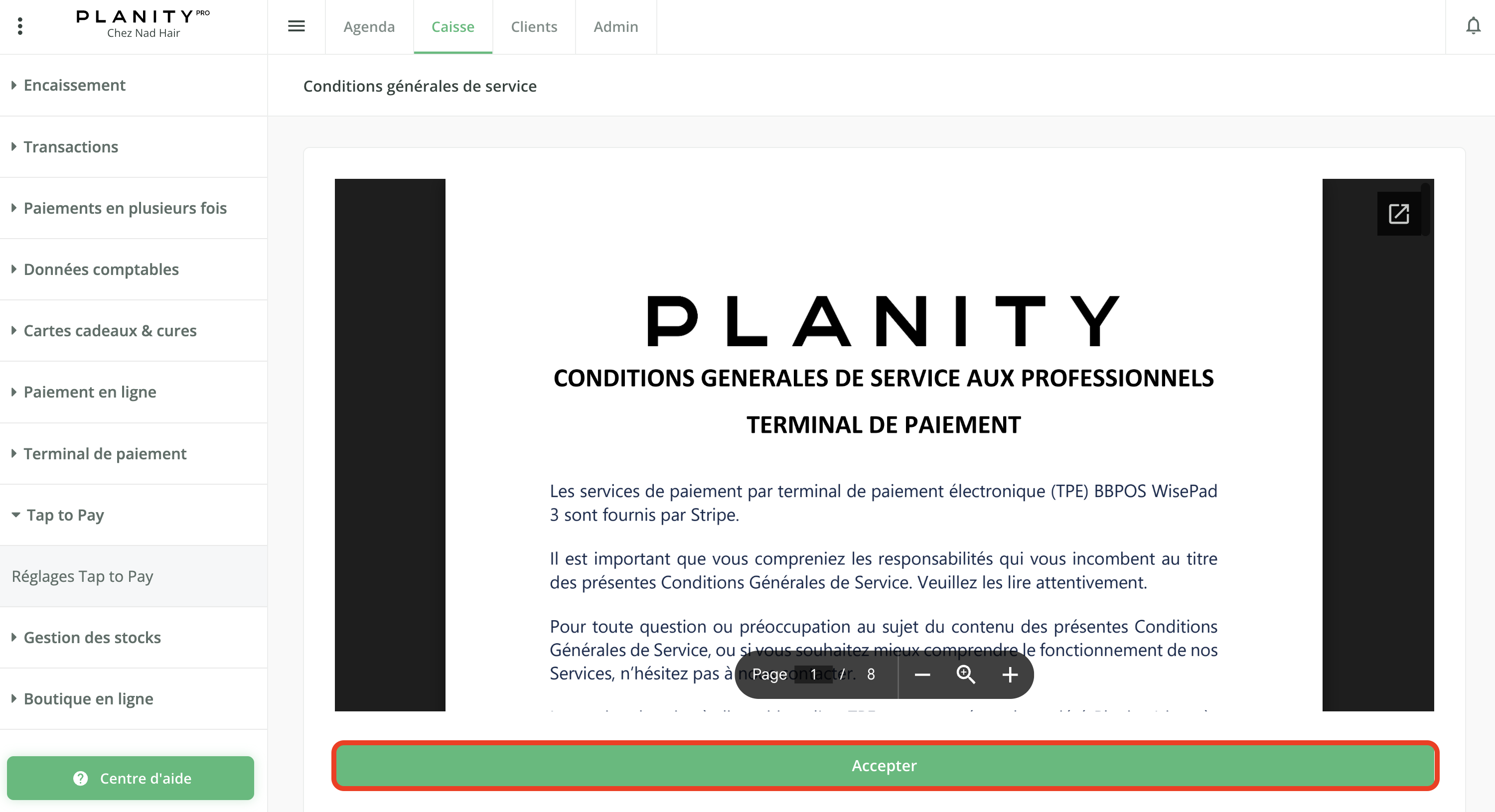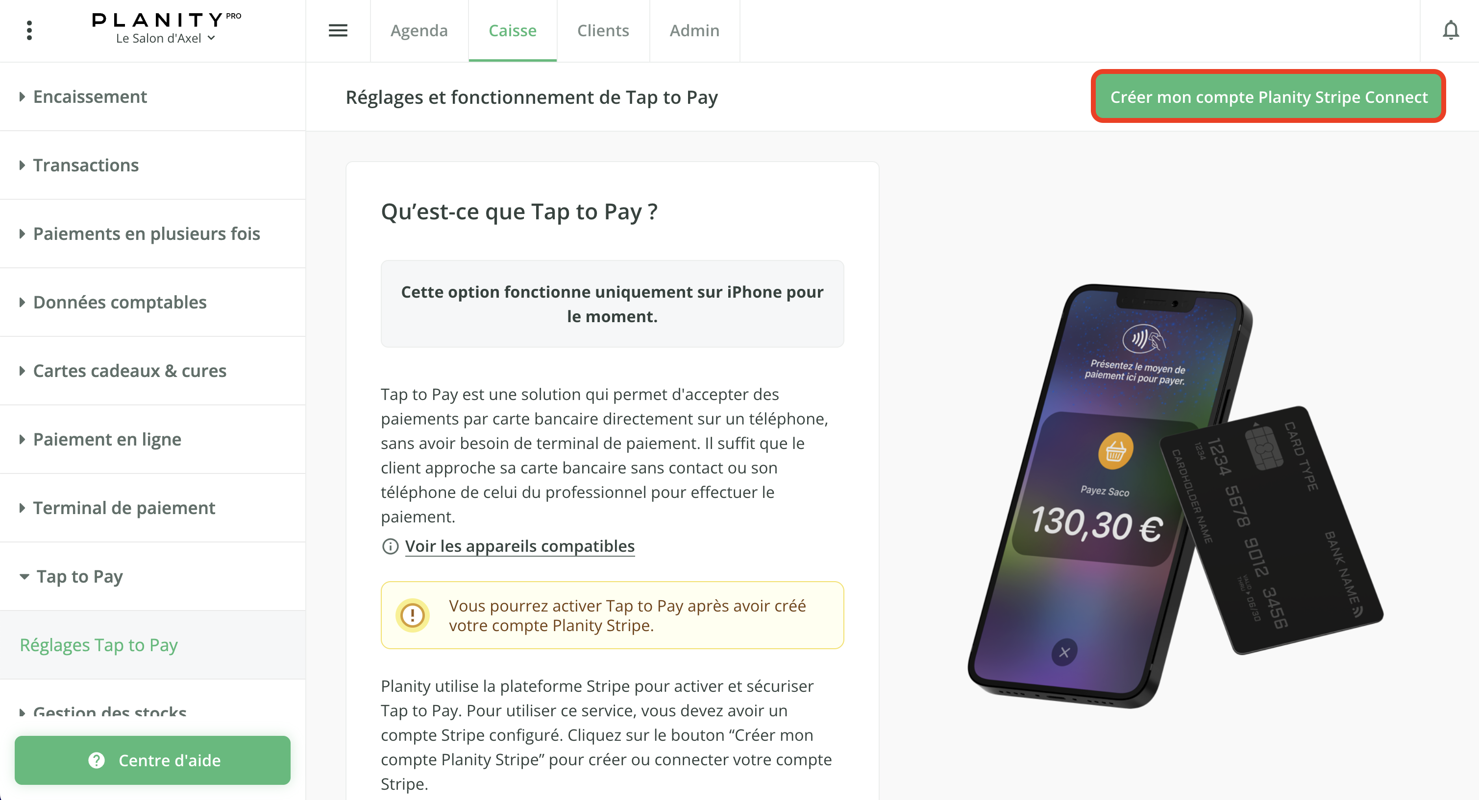 - Cliquez sur "Activer Tap to Pay" pour 9€ HT/mois pour une utilisation illimité sur tous vos appareils Apple (iPhone), dotés d'une puce NFC. Chaque transaction avec Tap to Pay sera facturée à 0,99% du montant payé. Ce montant sera débité en même temps que votre abonnement Planity.