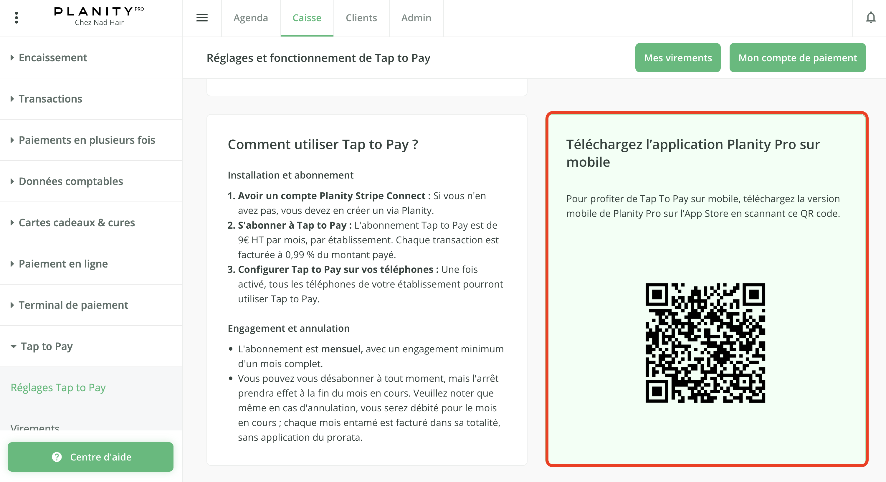 - Téléchargez l'application Planity Pro sur votre iPhone. Un QR Code qui vous permet de télécharger rapidement l'application est disponible sur votre page Tap to Pay de votre application.