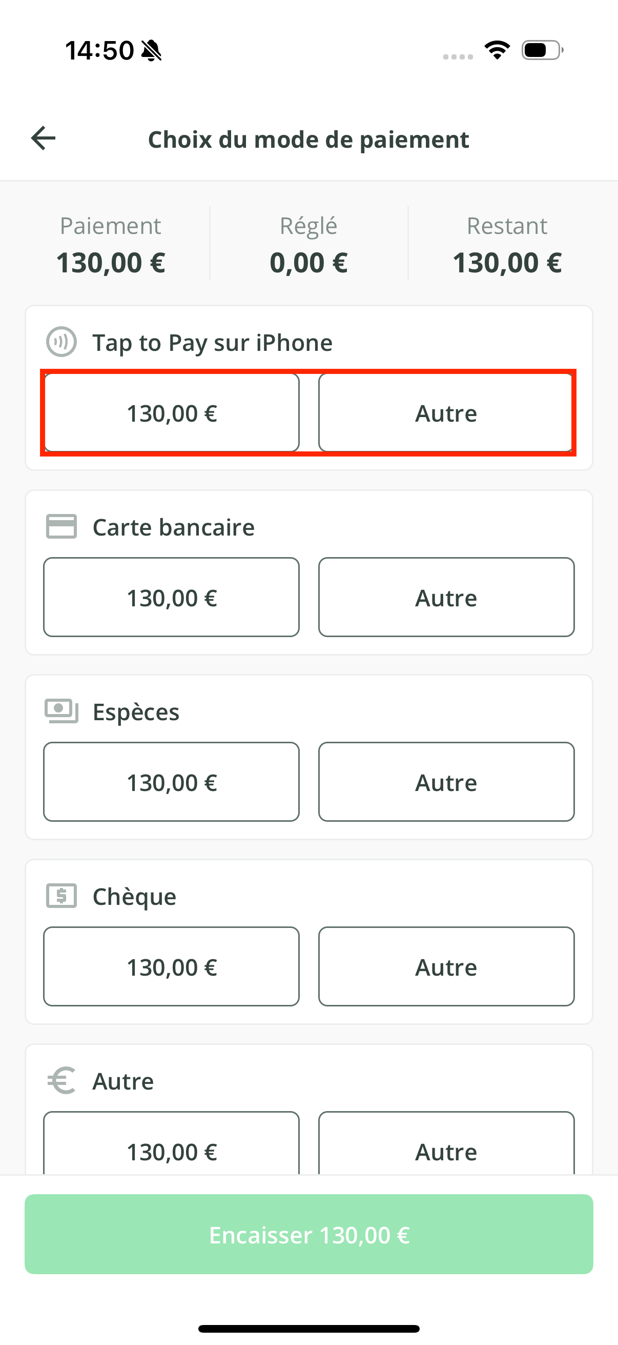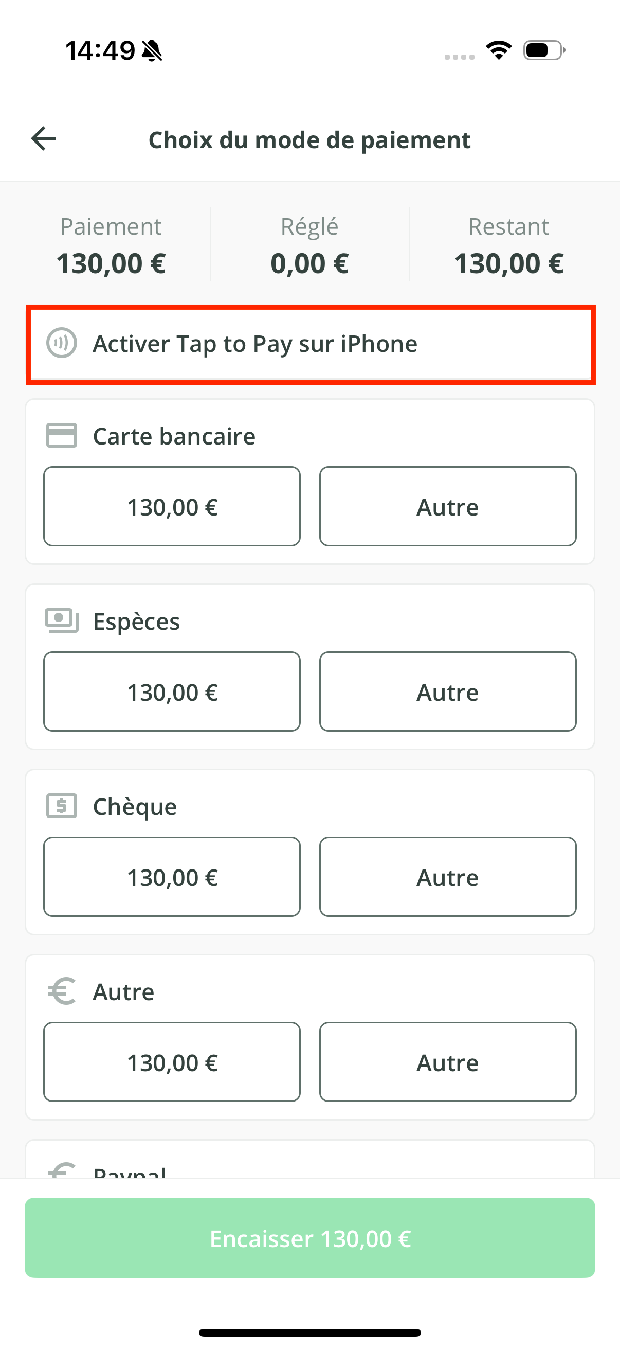 - Une fois activé, appuyez sur le montant à côté de Tap to Pay sur iPhone, comme pour un moyen de paiement classique.