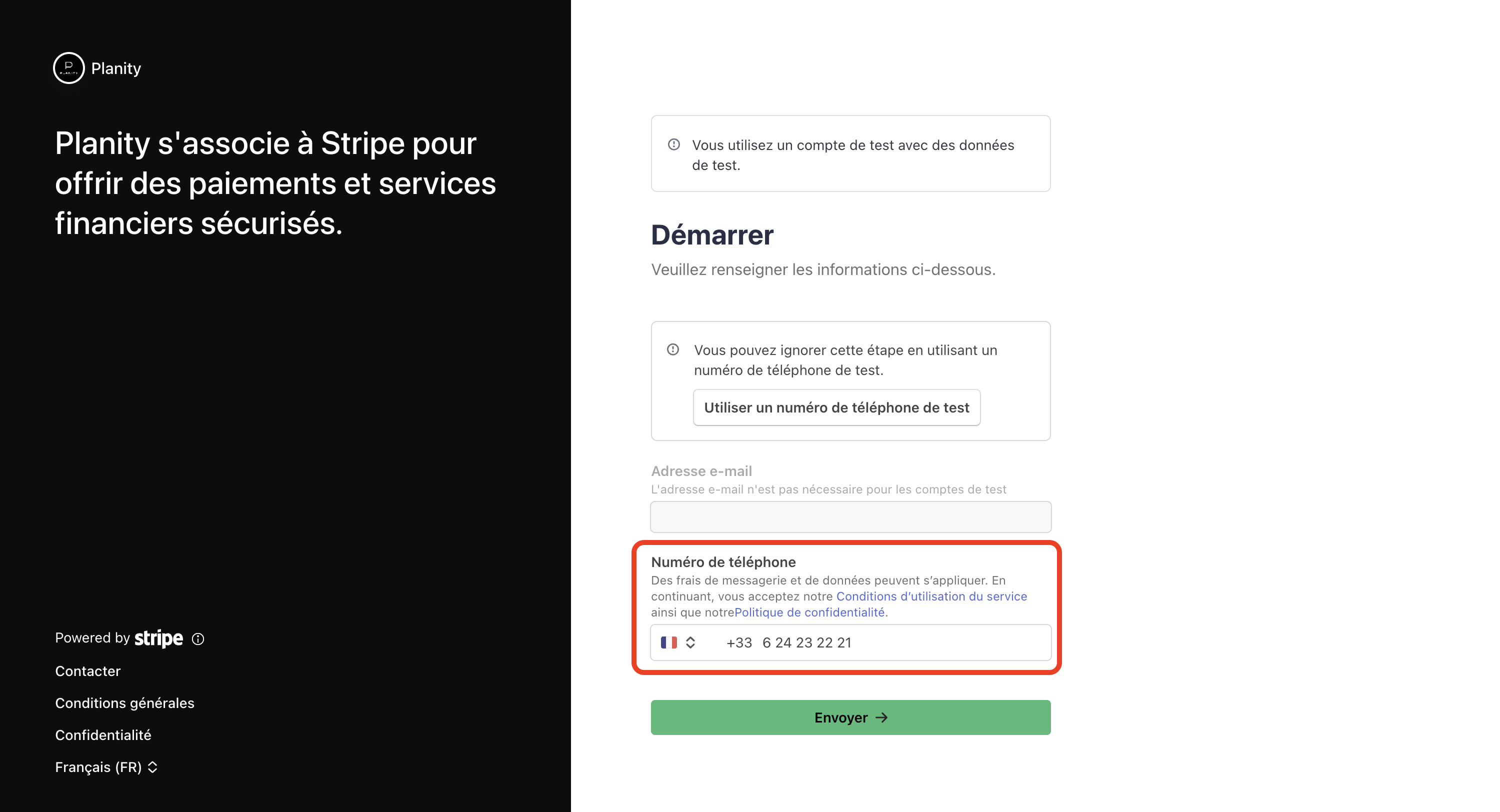 - L'inscription Stripe commence alors. Pour démarrer, indiquez votre numéro de téléphone.