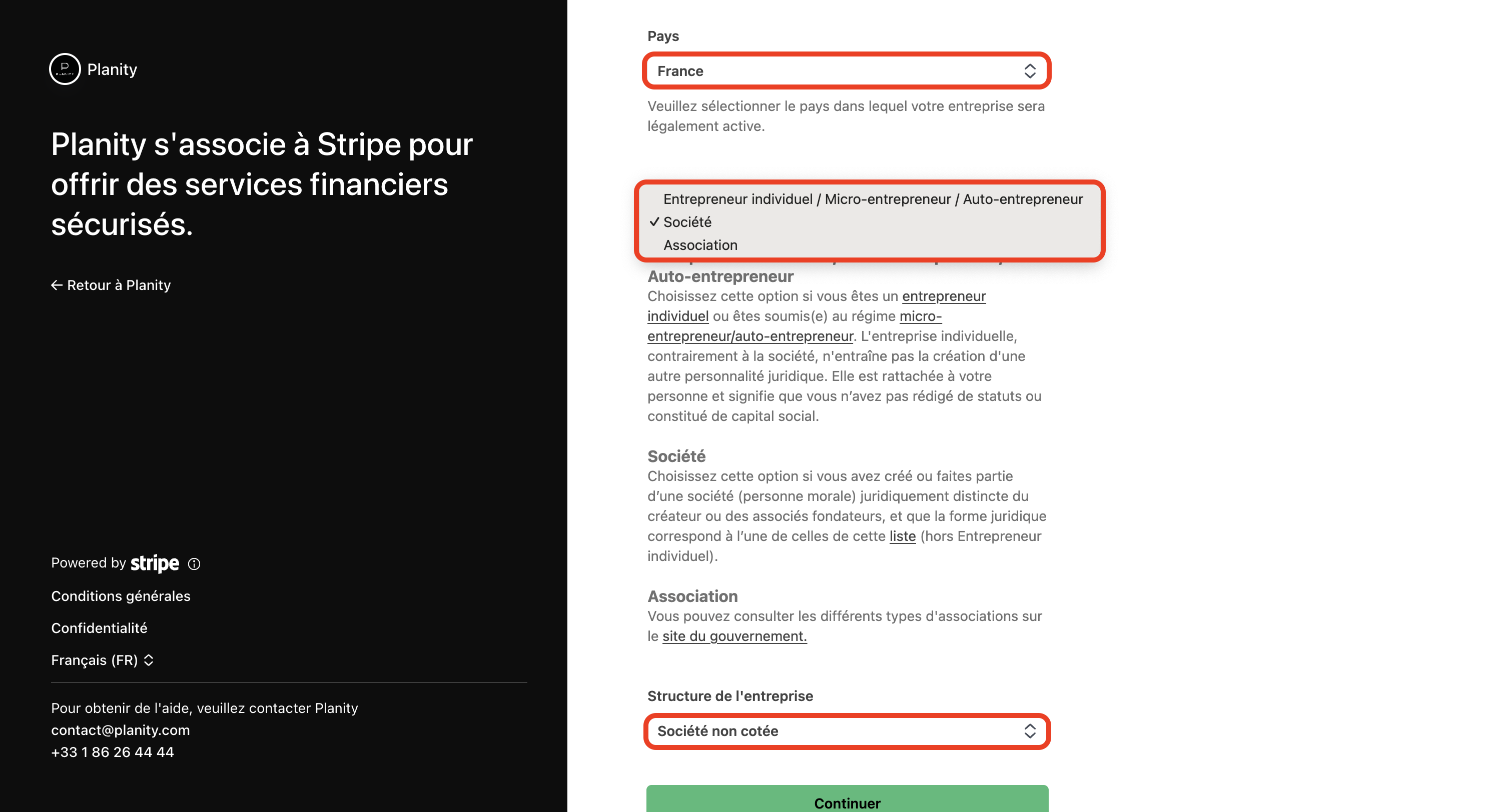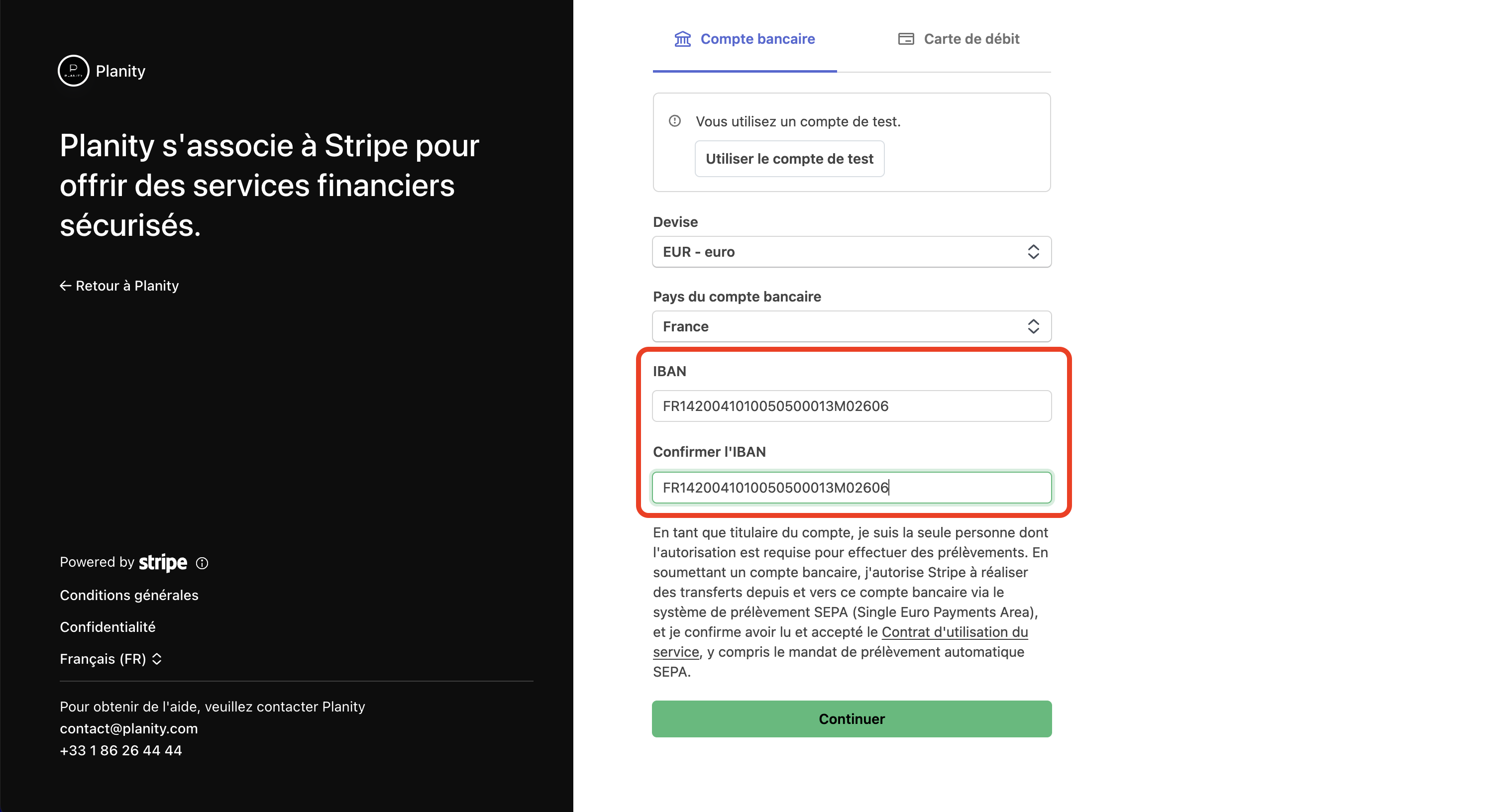 - Cliquez sur Créer mon compte Planity Stripe Connect.