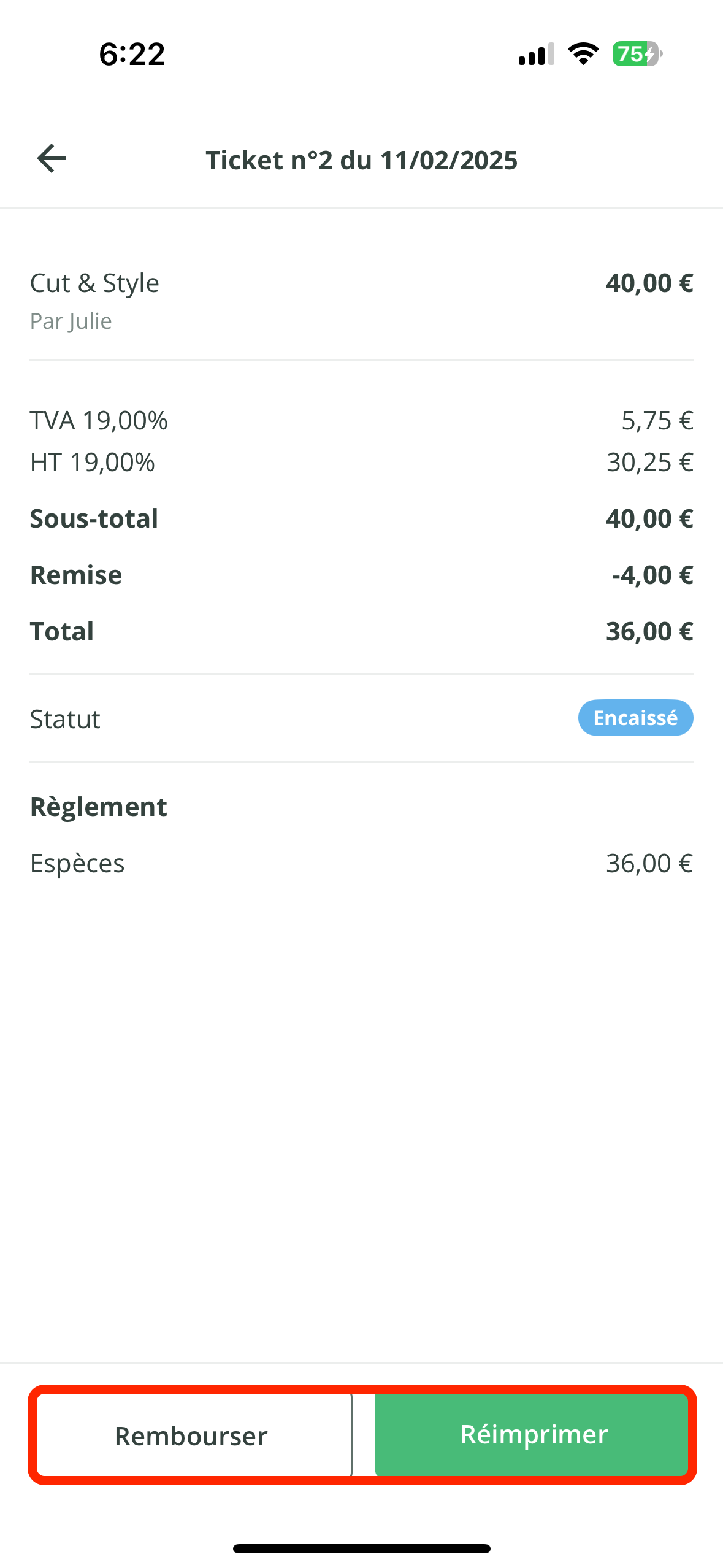 - Pour chaque ticket, vous pouvez le Rembourser ou le Réimprimer avec les boutons en bas de votre écran.