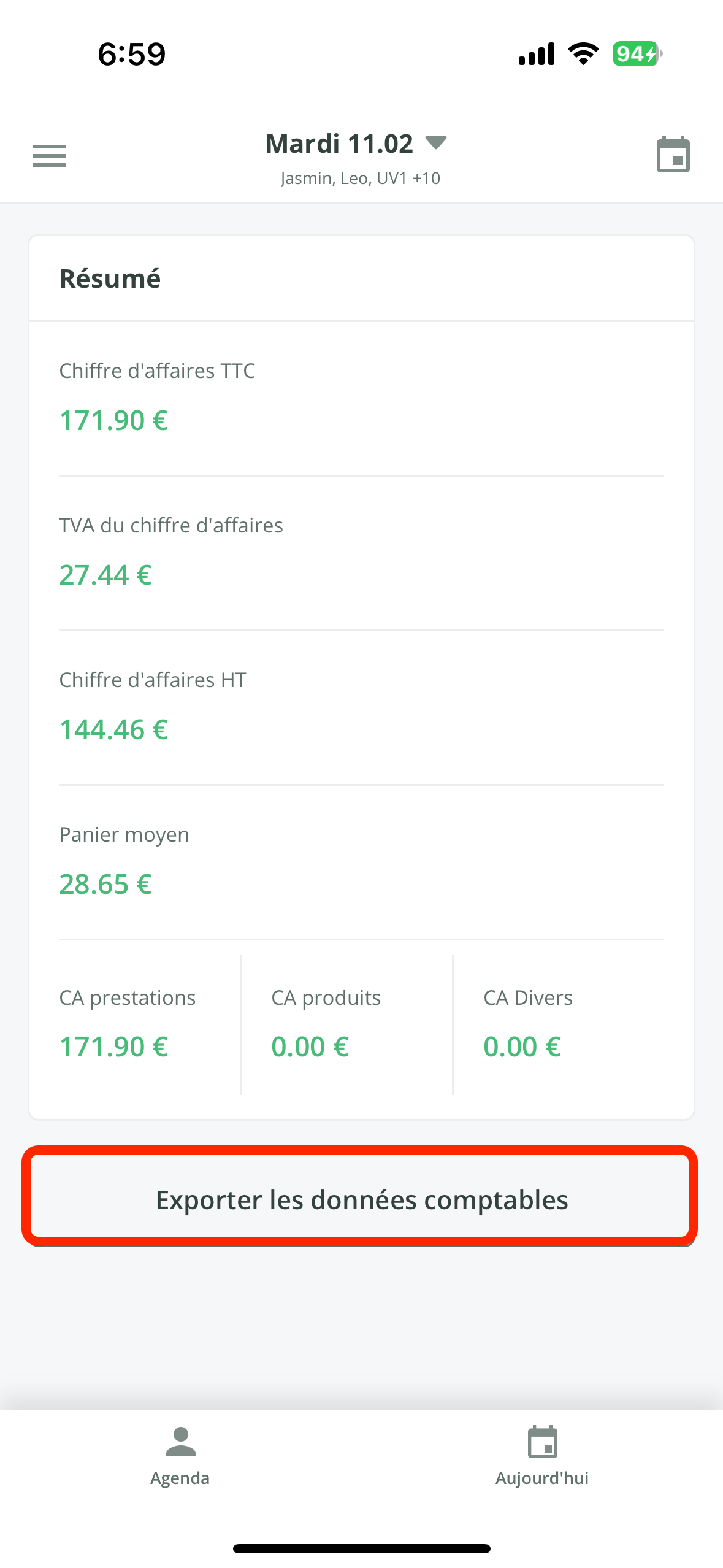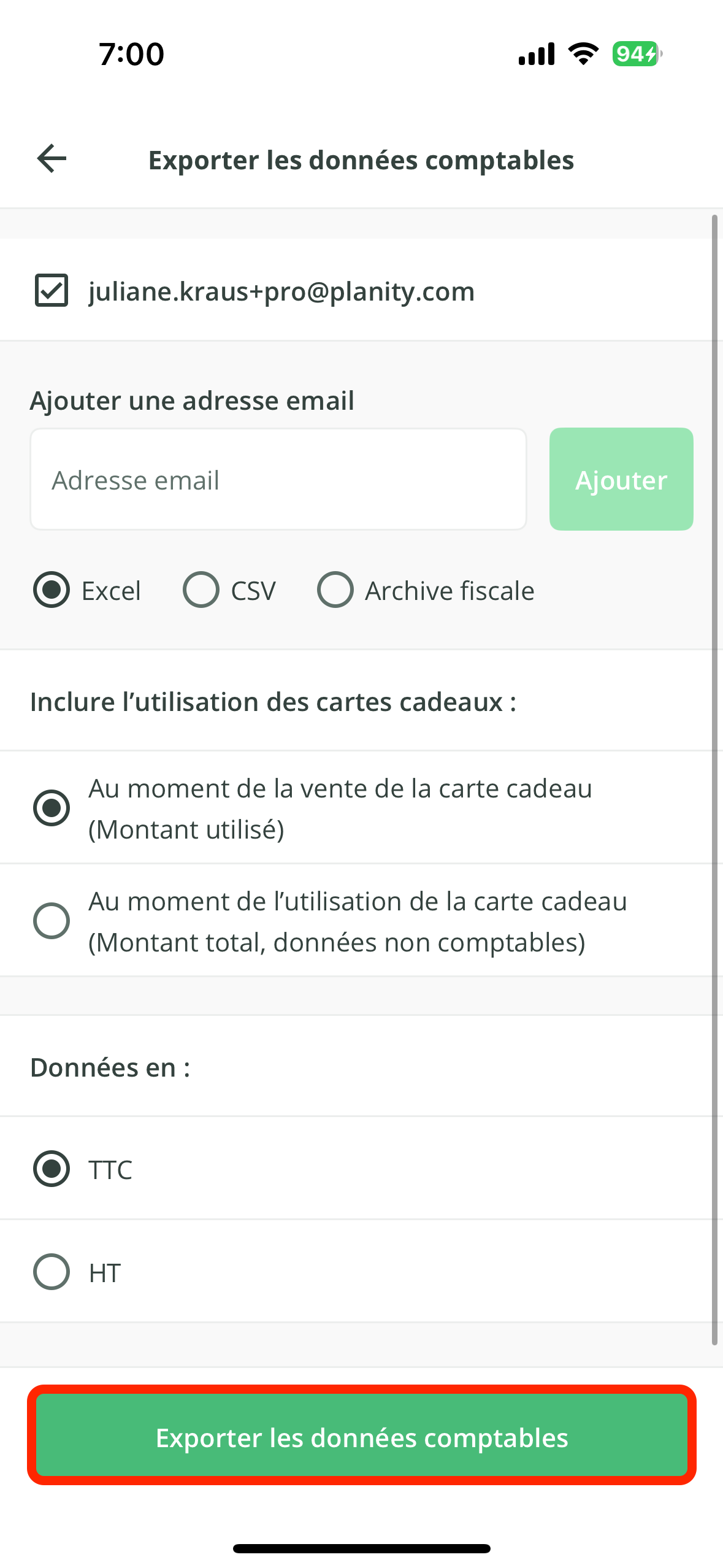- Avant de cliquer sur Exporter les données comptables pour confirmer l'envoi, vous pouvez alors :