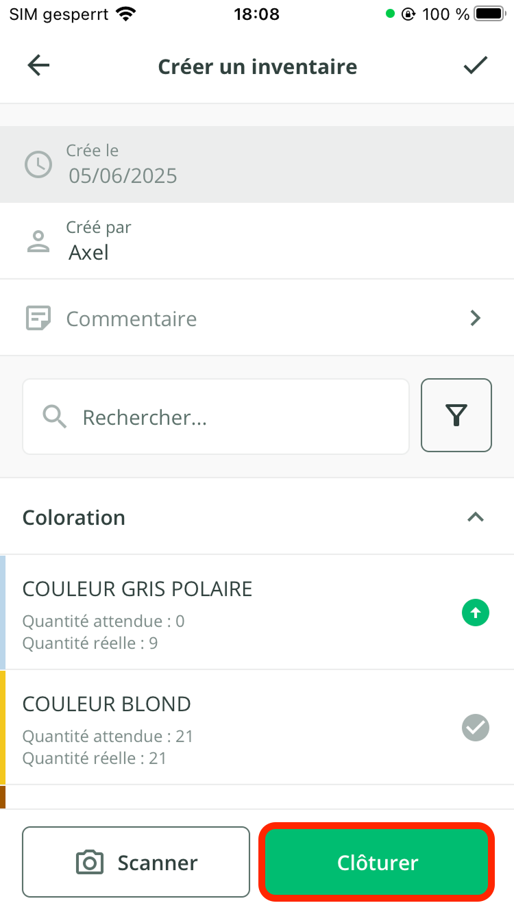 Cliquez sur Clôturer pour terminer votre inventaire. Sinon cliquez sur le V en haut à droite pour le sauvegarder et le reprendre plus tard.