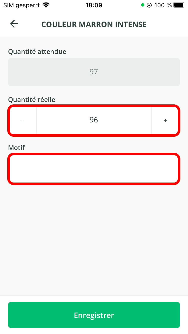 Dans le cas où la quantité réelle n'est pas égale à la quantité attendue, vous pourrez rentrer un motif de cet écart de quantité. Cette raison apparaîtra sur le compte rendu final de votre inventaire.