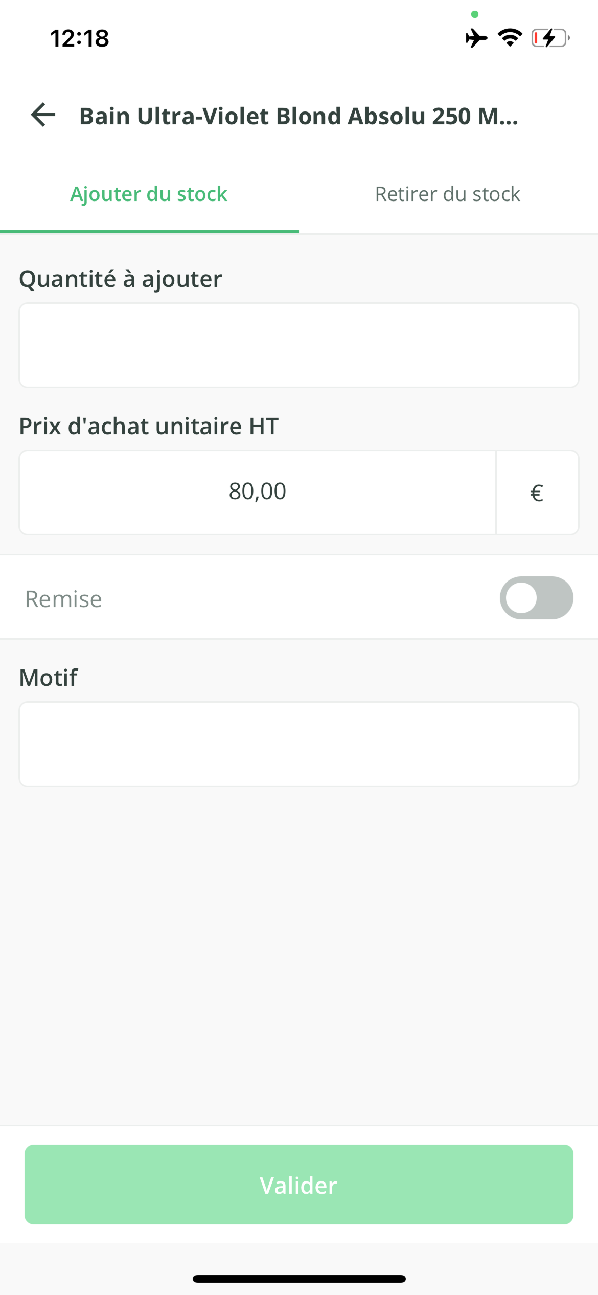 - En cas d'augmentation, il vous suffit de saisir la quantité à ajouter au stock. Vous pouvez aussi modifier le prix d'achat HT, appliquer une remise sur le prix d'achat, et saisir un motif.