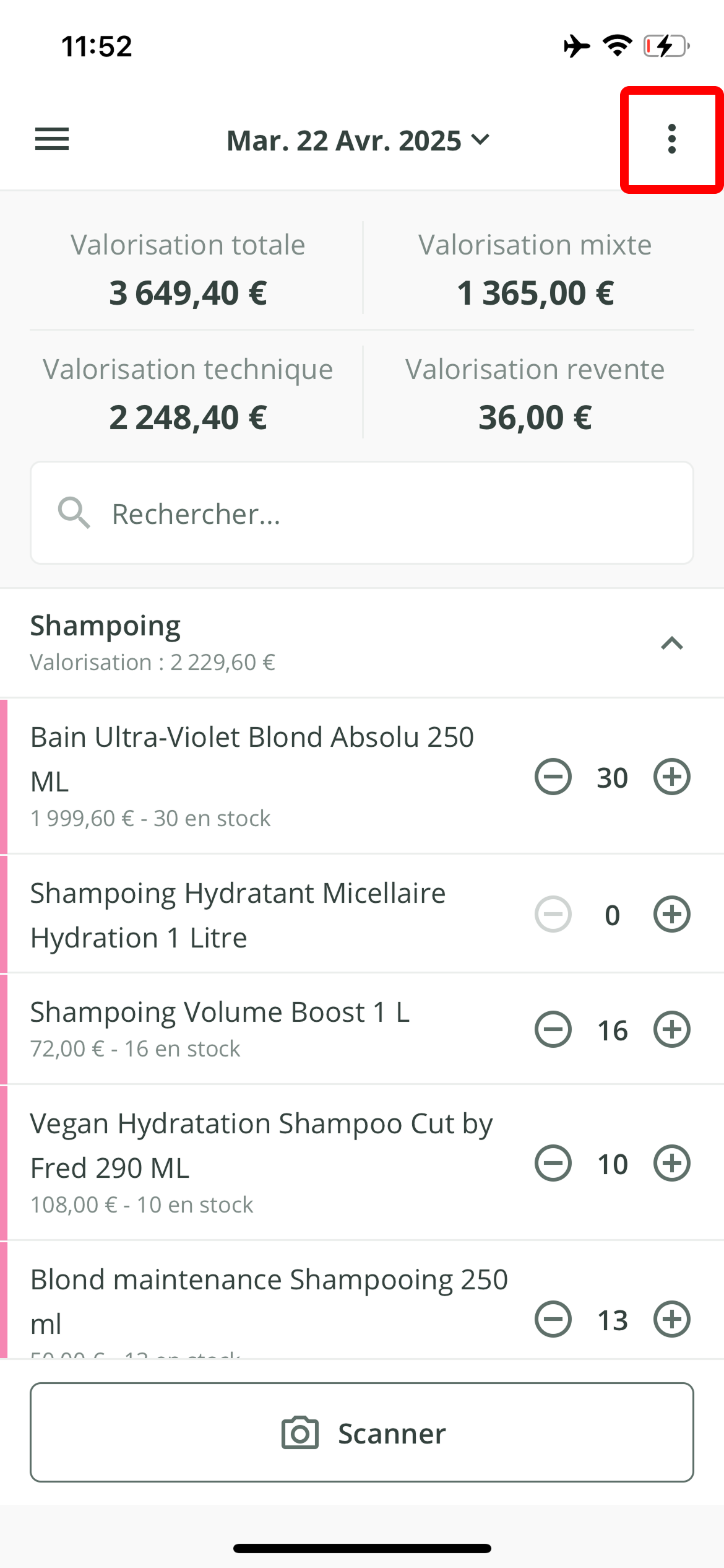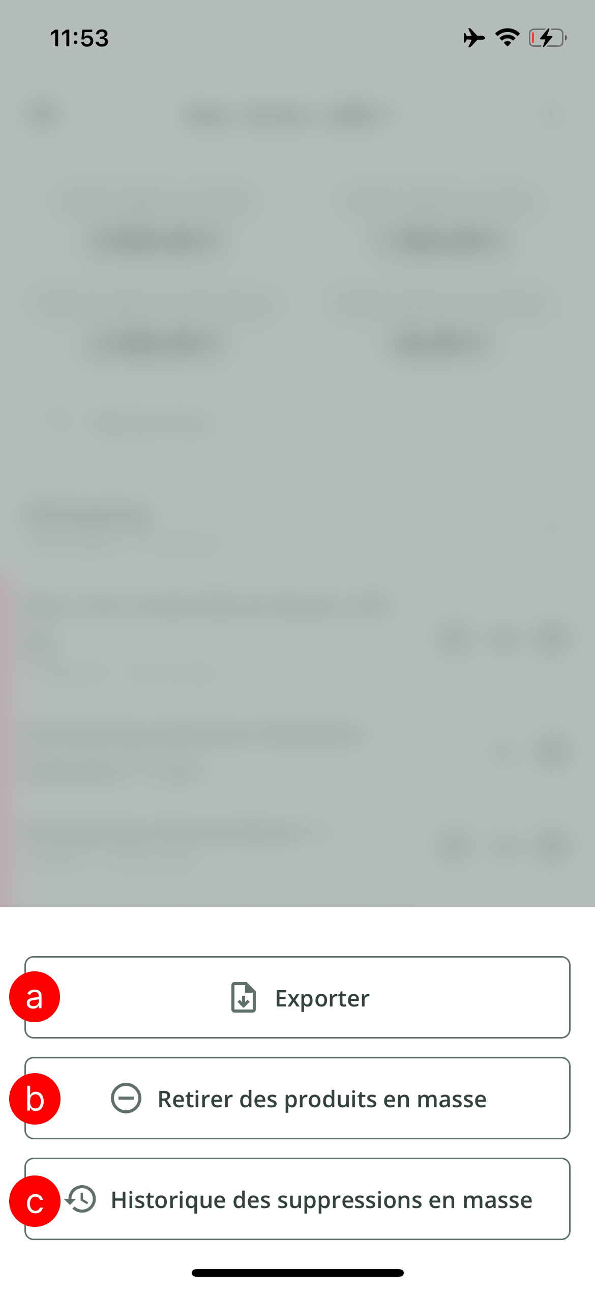 - Il est possible d'accéder à d'autres fonctionnalités pour mieux gérer vos stocks de produits. Pour cela, cliquez sur les 3 points en haut à droite de votre écran.