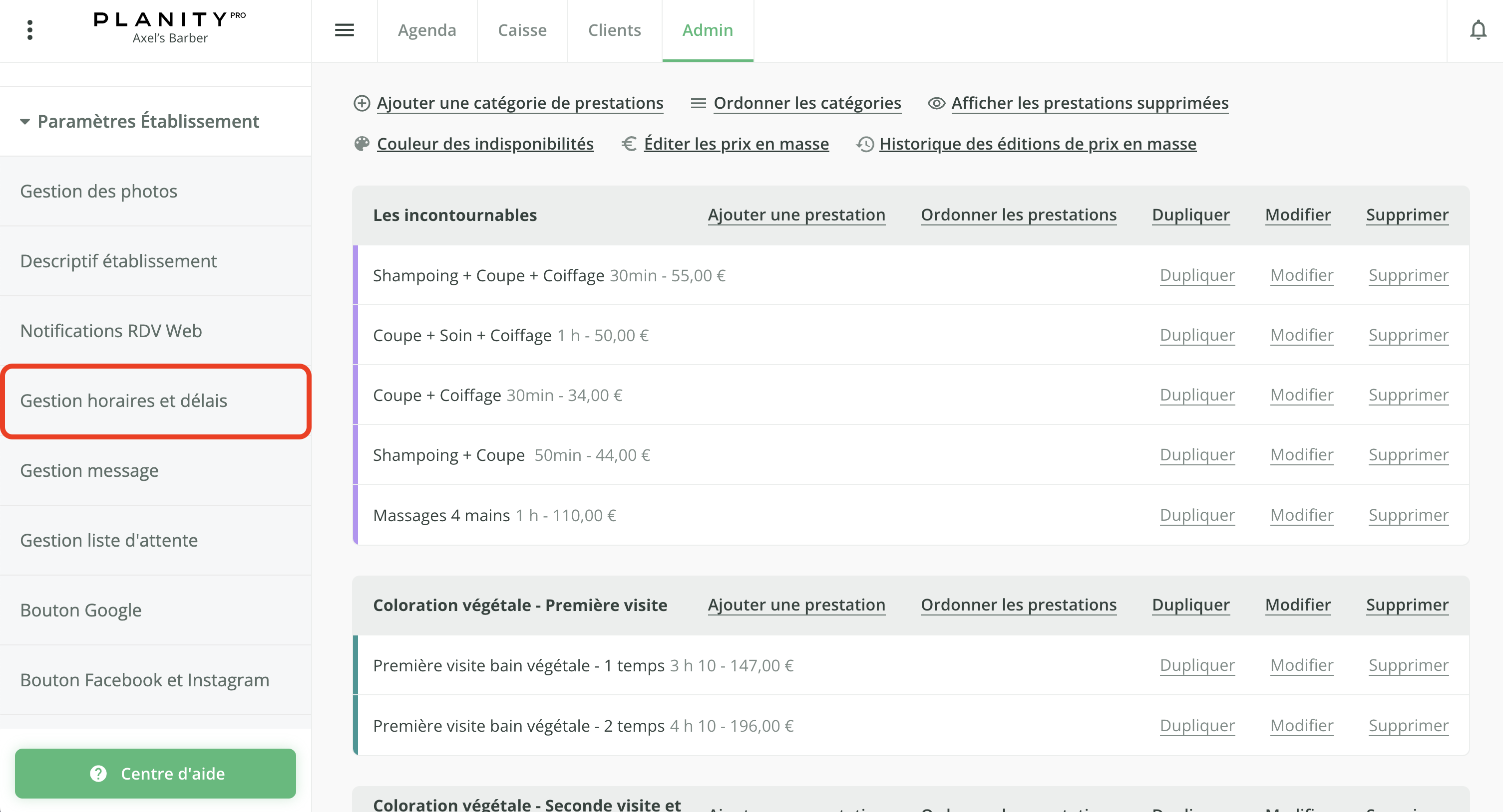- Cliquez sur le sous-menu Gestion horaires et délais.