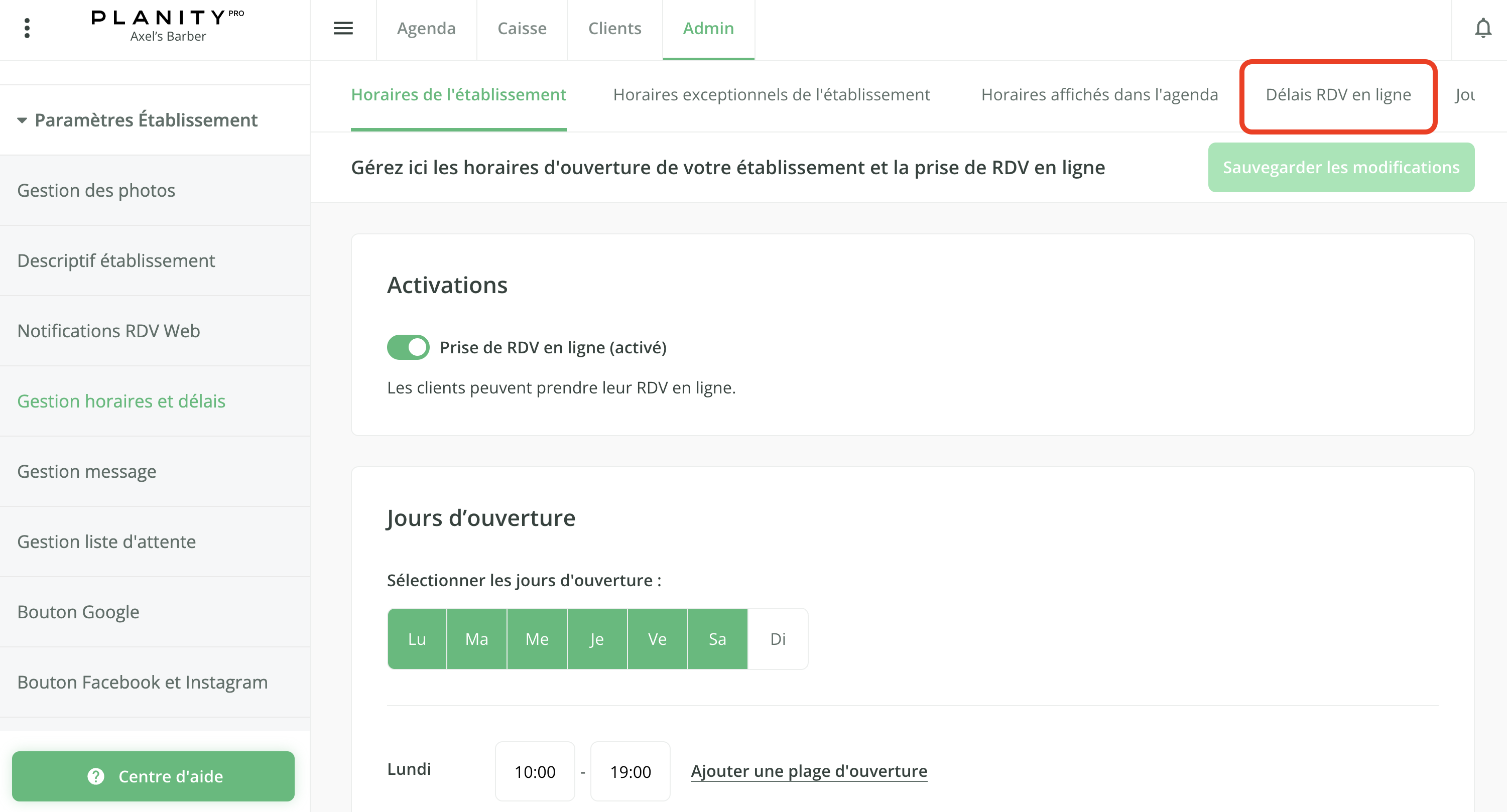 - Cliquez sur l'onglet Délais RDV en ligne.