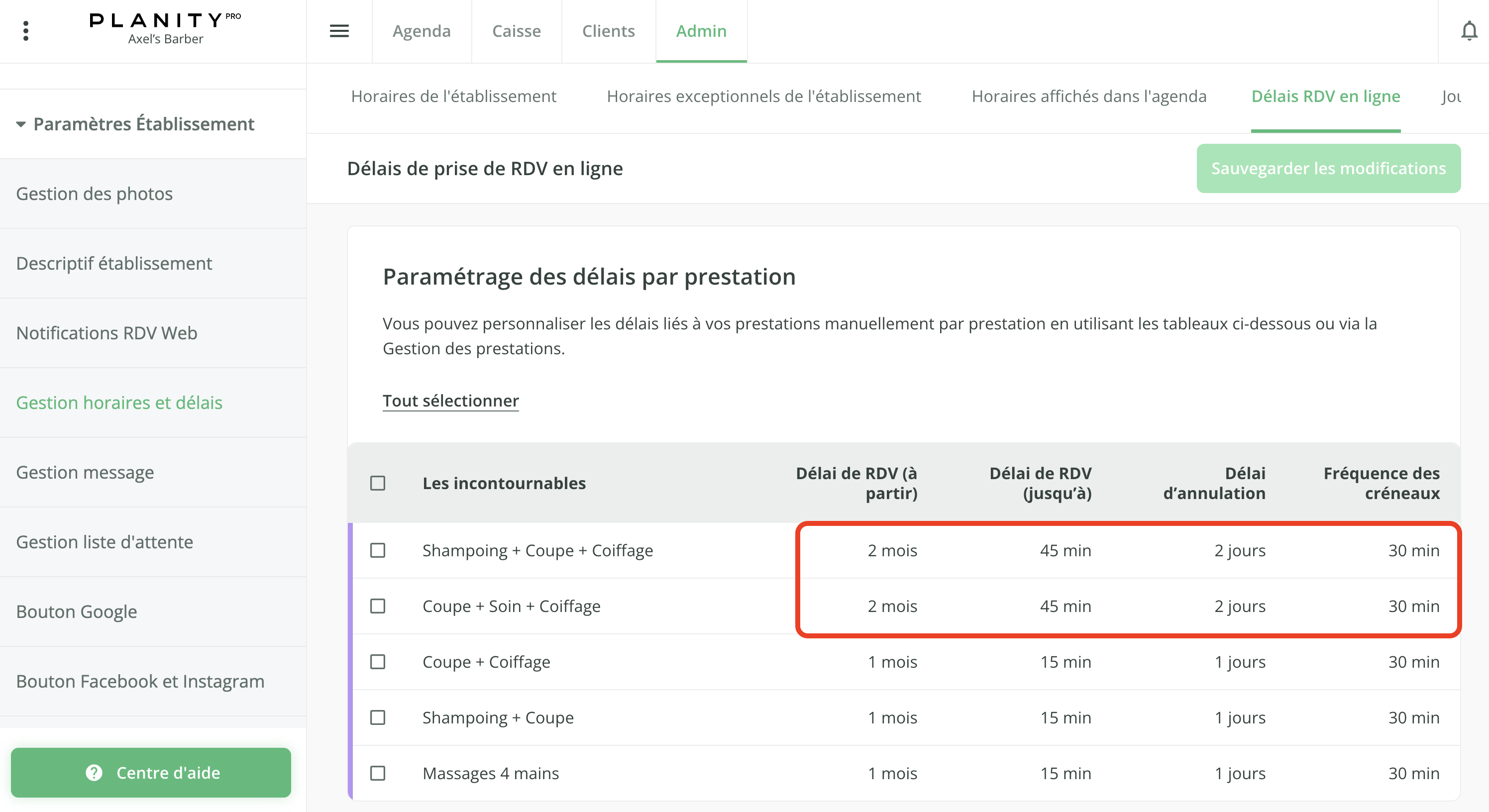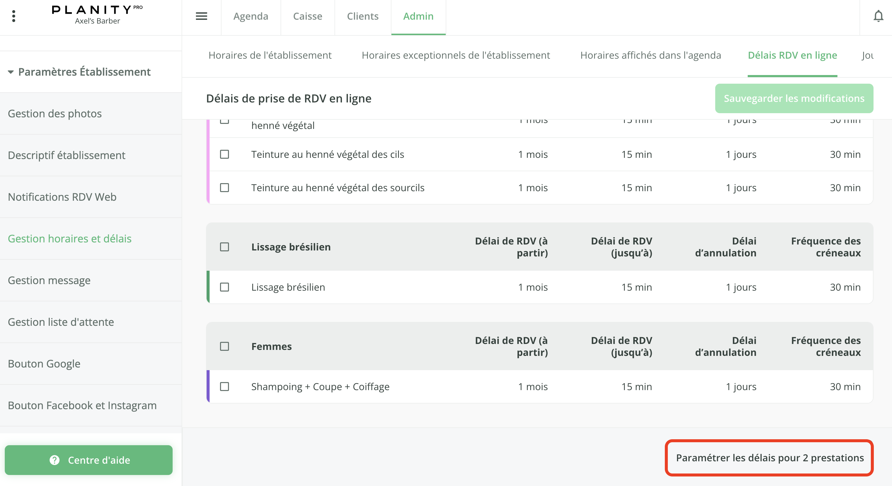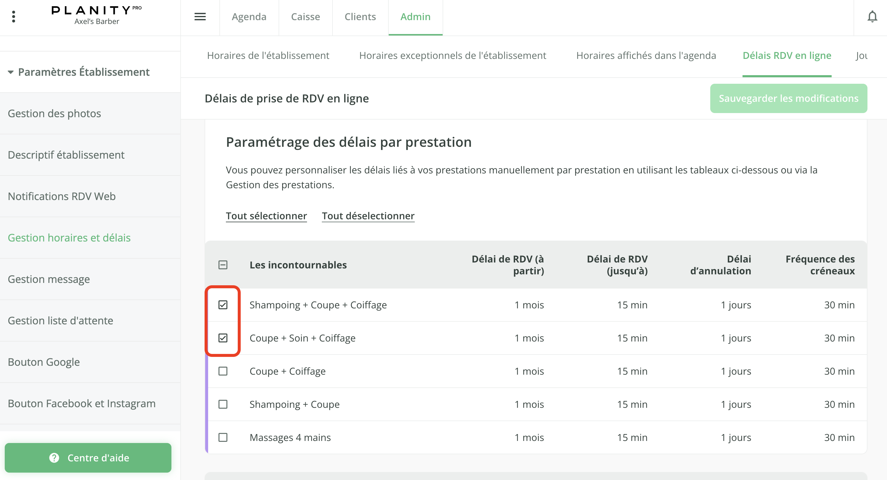 - Ici, lorsque vous descendez sur la page, vous pouvez alors personnaliser le délai de prise de RDV pour chaque prestation. Cochez alors toutes les prestations que vous souhaitez modifier avec le même délai.