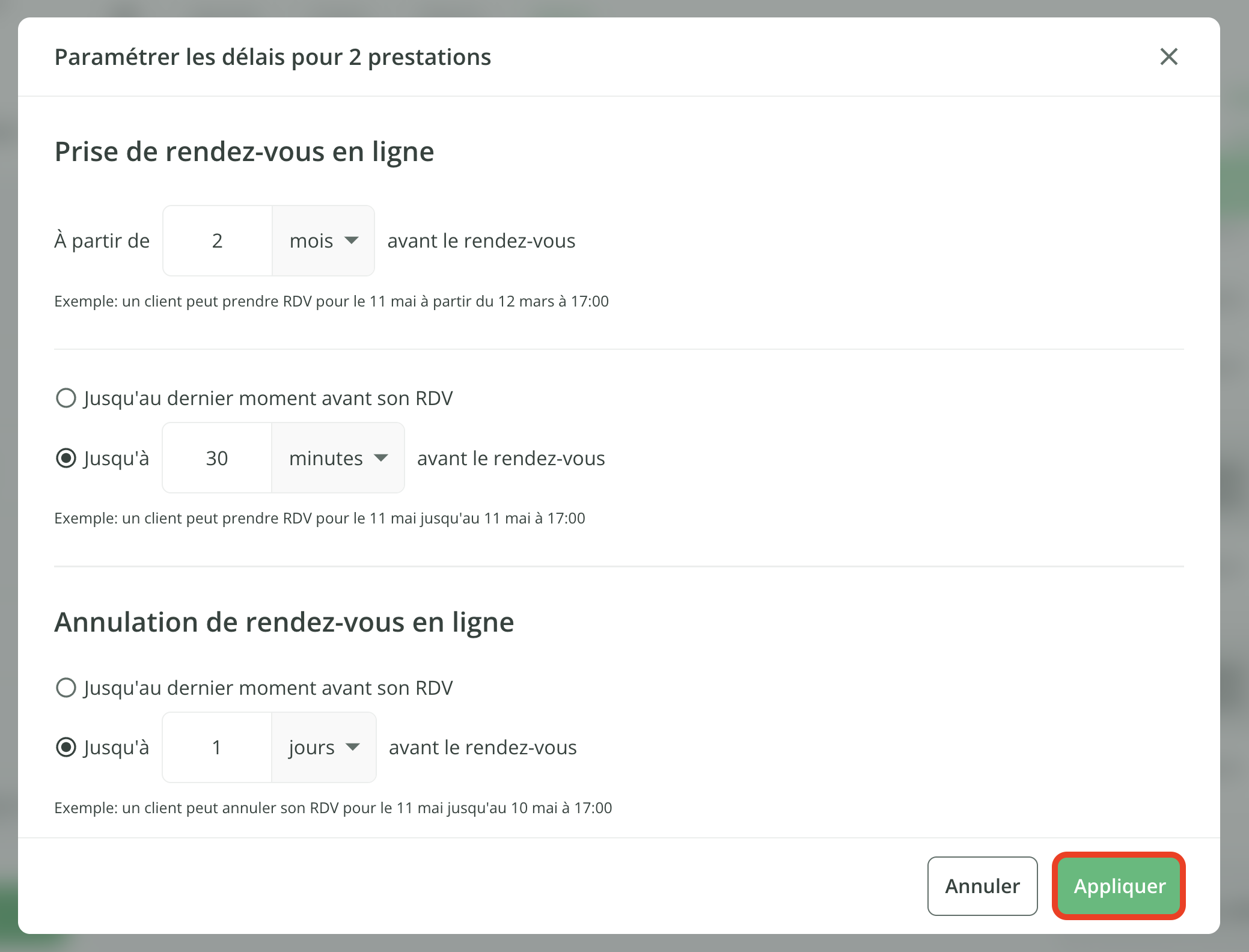 - Paramétrer les délais puis cliquez sur Appliquer.