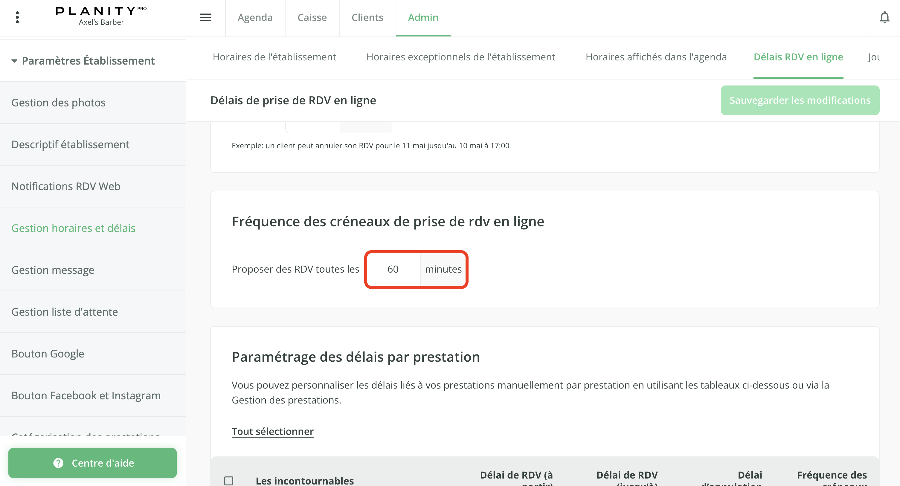 ℹ️ Attention, la fréquence des créneaux doit se terminer par 0 ou 5 minutes. (ex : 60 minutes, 35 minutes etc.)