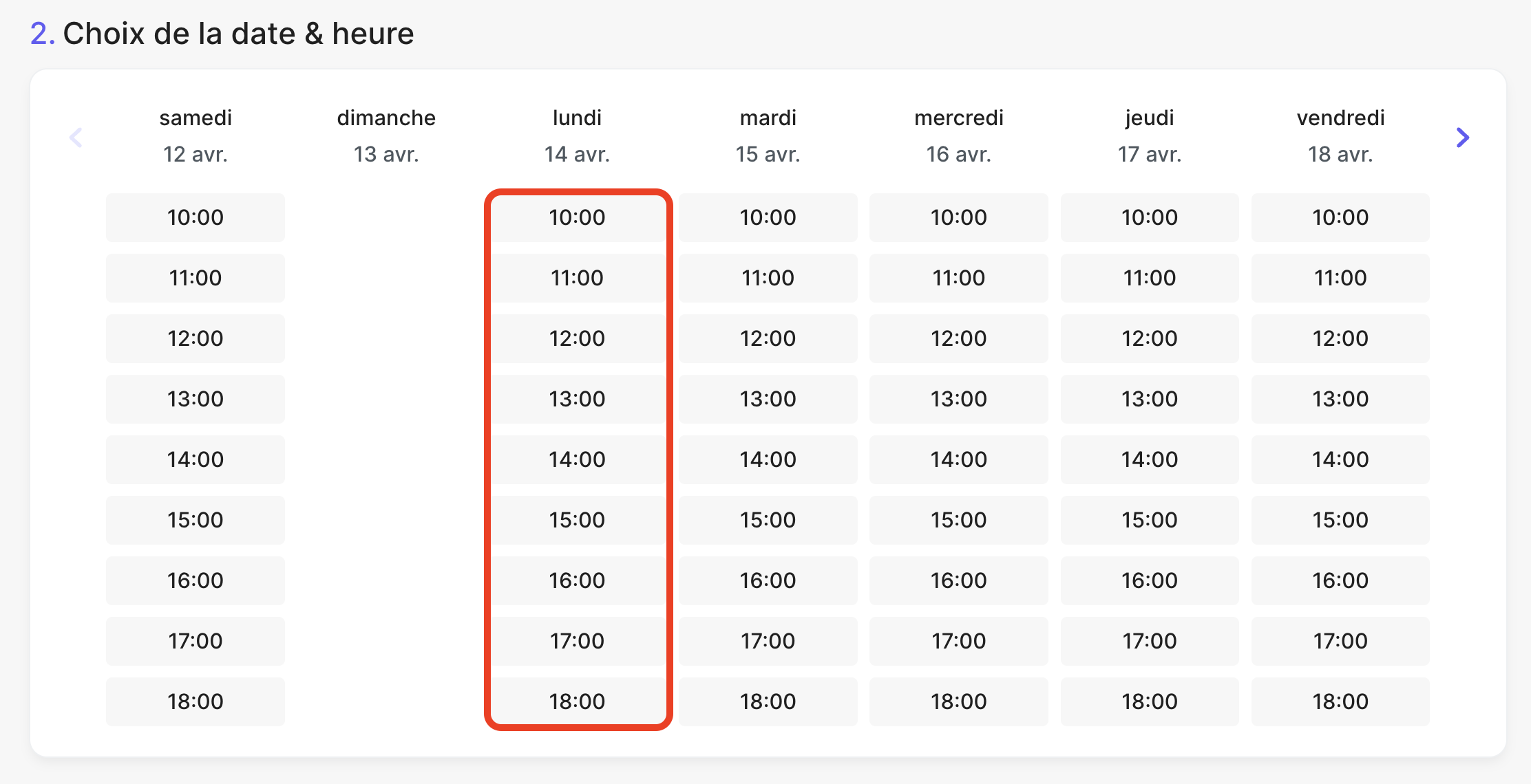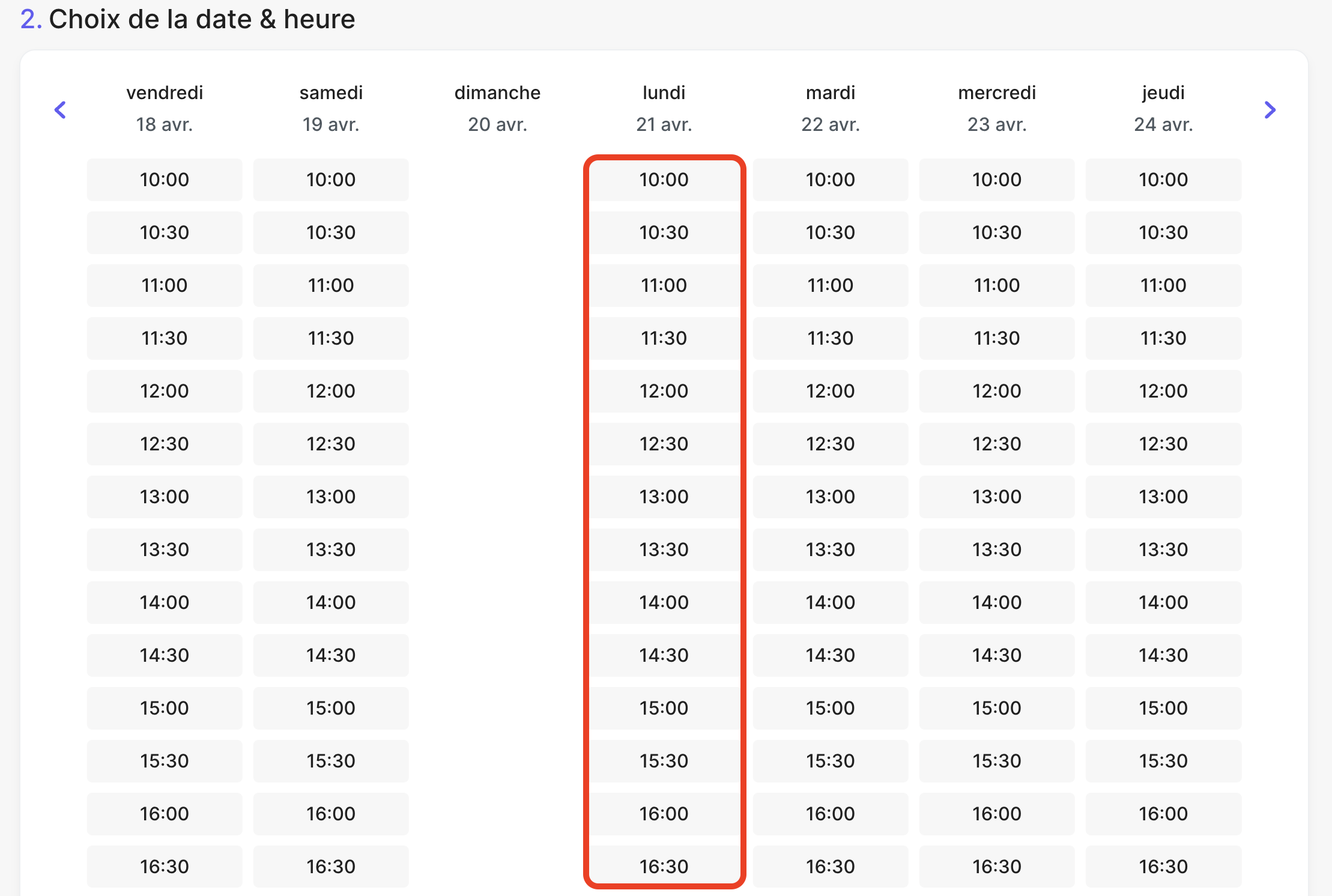 Par exemple, si vous définissez une fréquence de 30 minutes, vos clients pourront uniquement réserver des rendez-vous toutes les 30 minutes (ex. : 9h00, 9h30, 10h00, etc.)