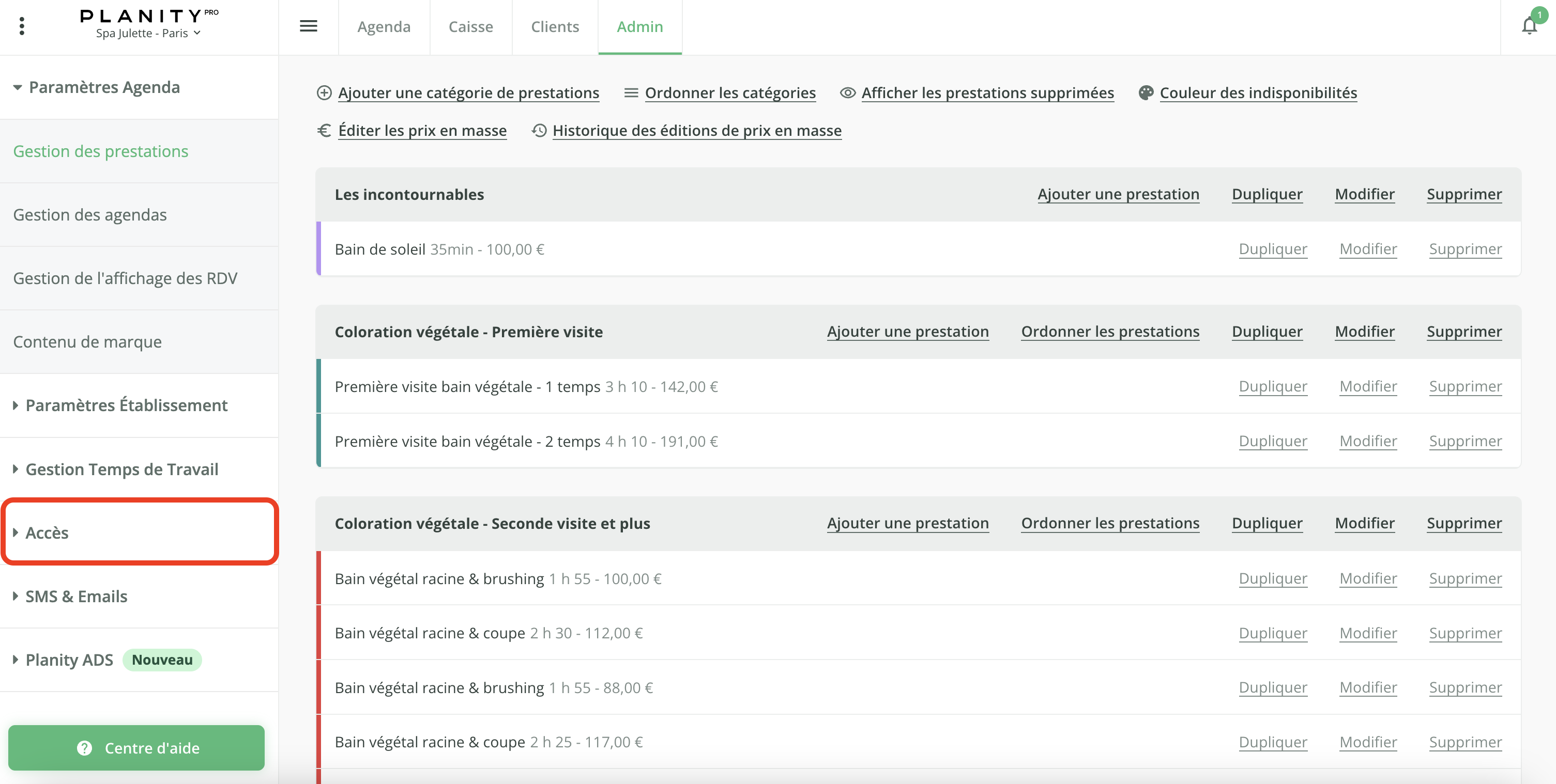 - Cliquez sur le menu Accès.