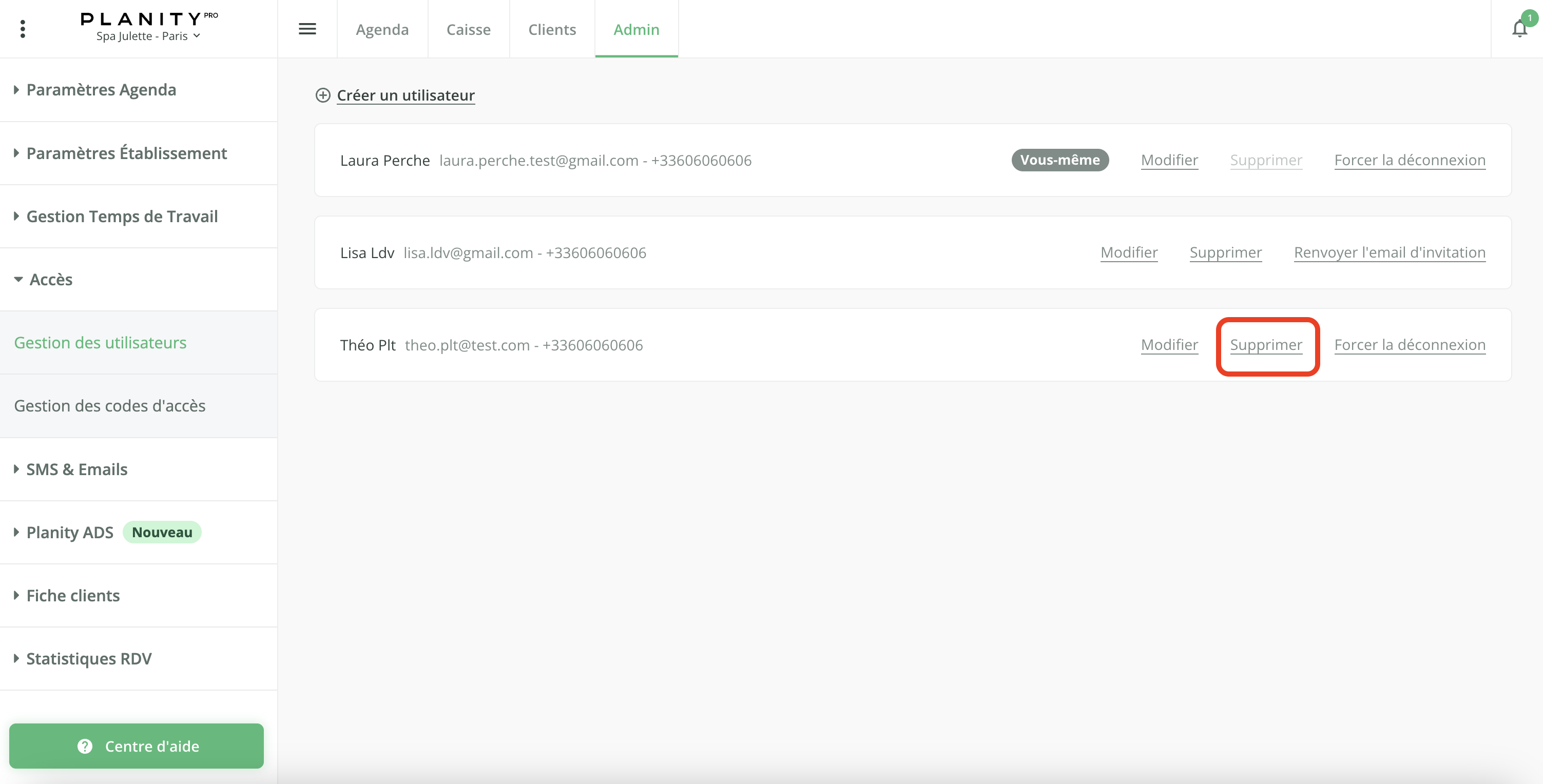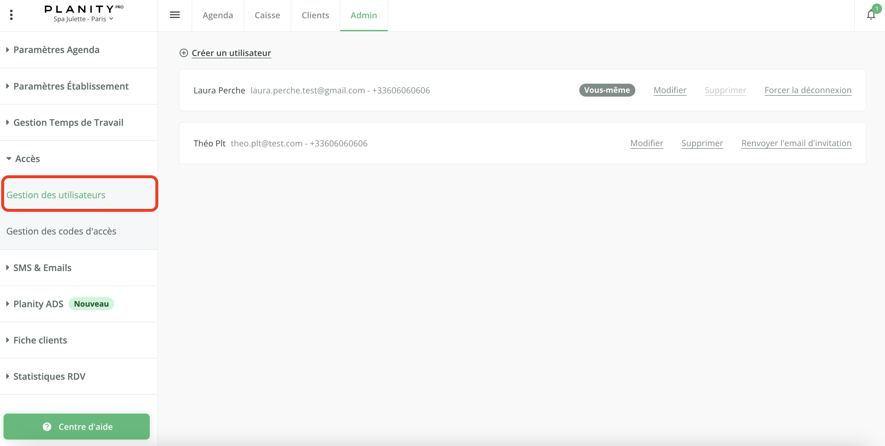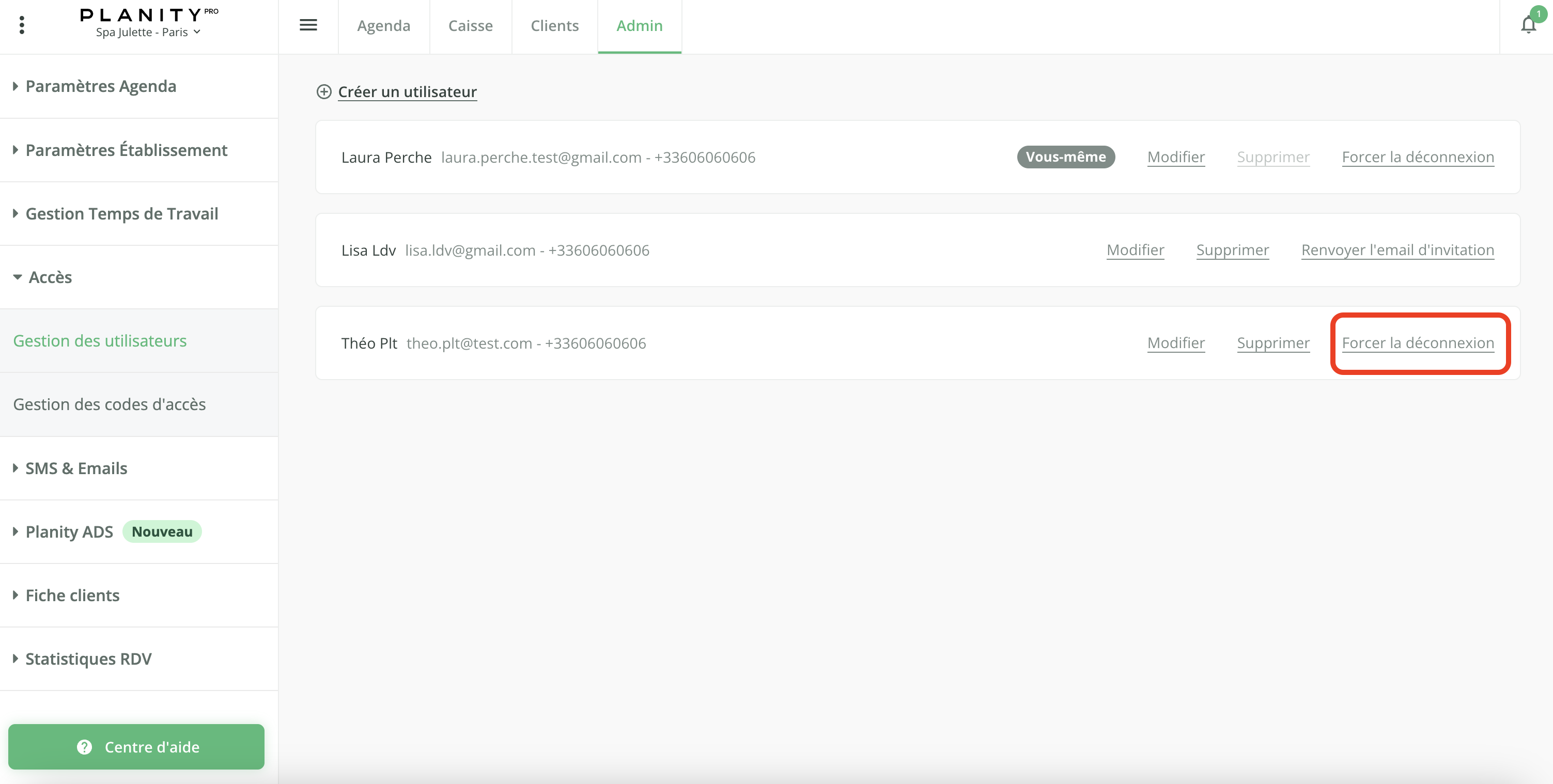 Vous pouvez créer, modifier, supprimer des utilisateurs ou forcer leur déconnexion à tout moment.