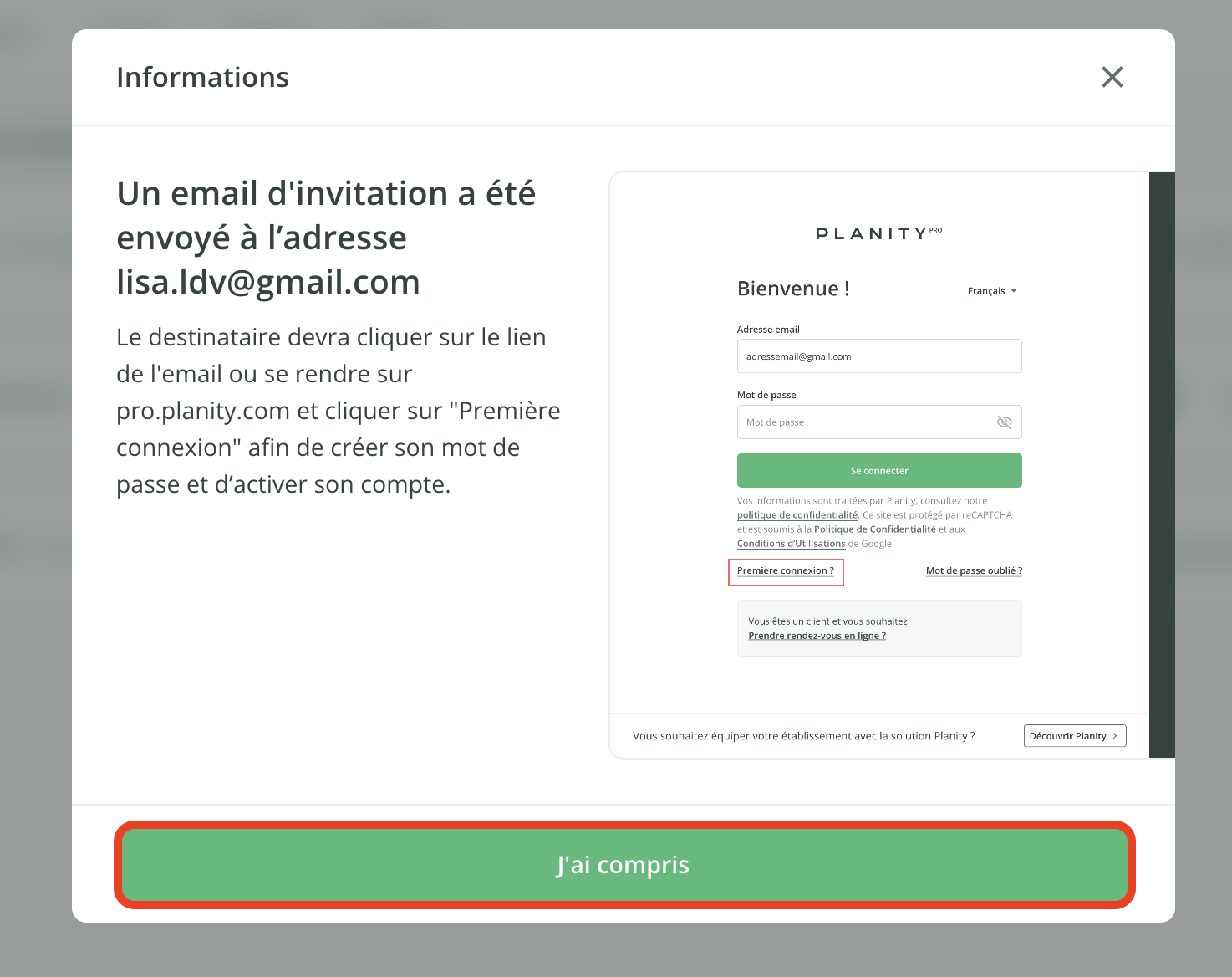 - Une fenêtre vous confirmera qu'un email d’invitation a été envoyé à l'utilisateur. Cliquez sur le bouton J'ai compris pour revenir à la liste de vos utilisateurs.