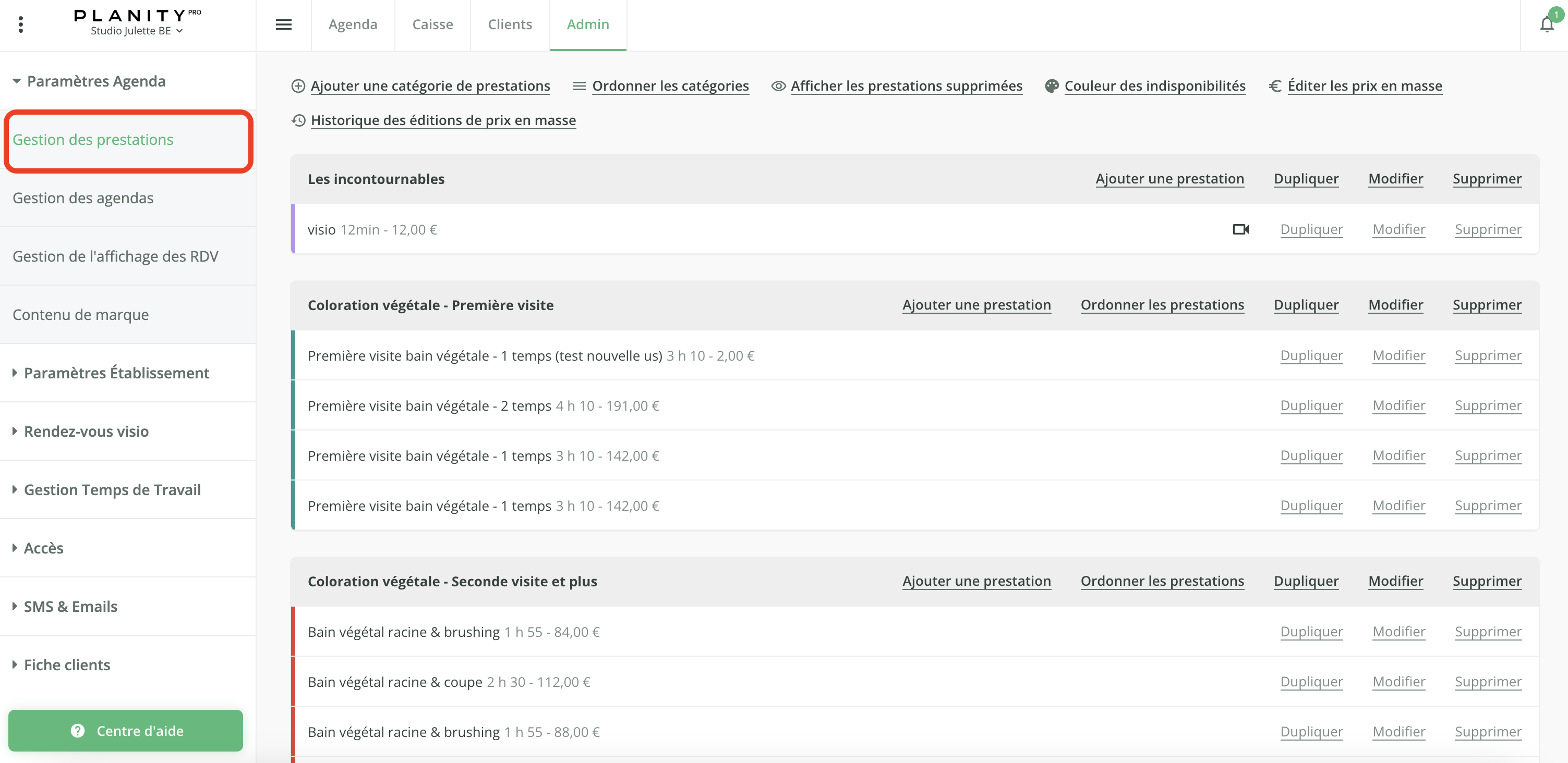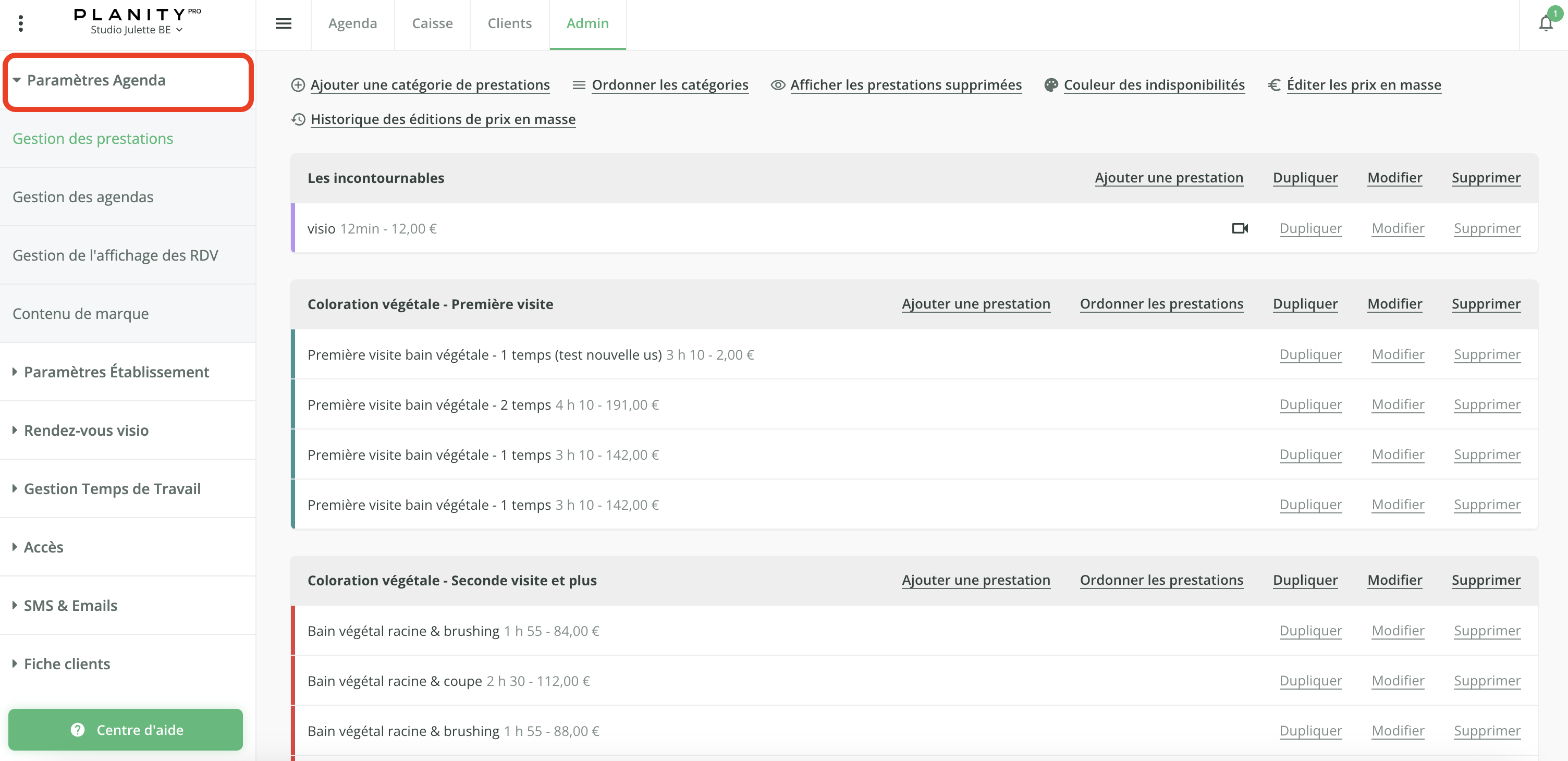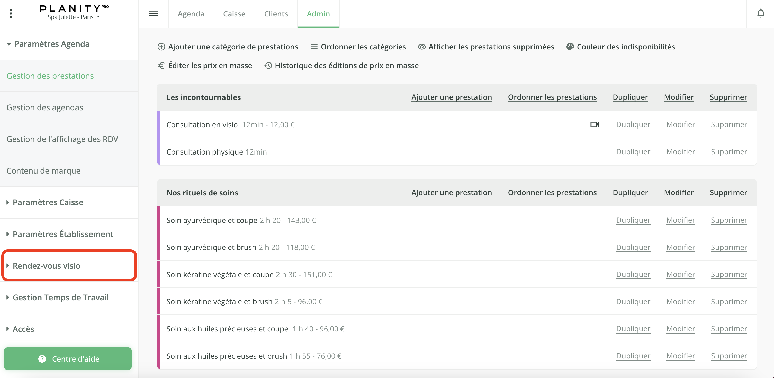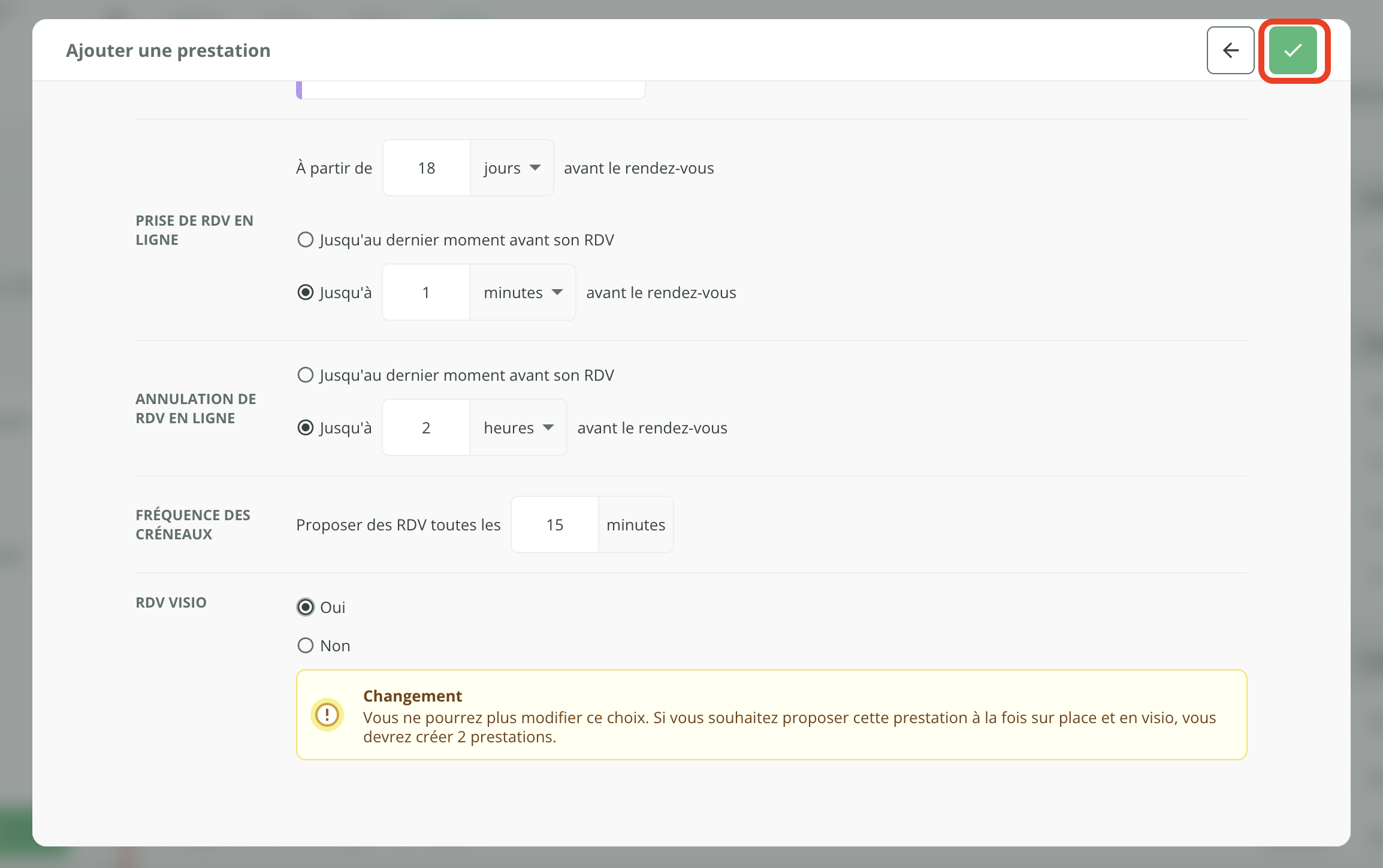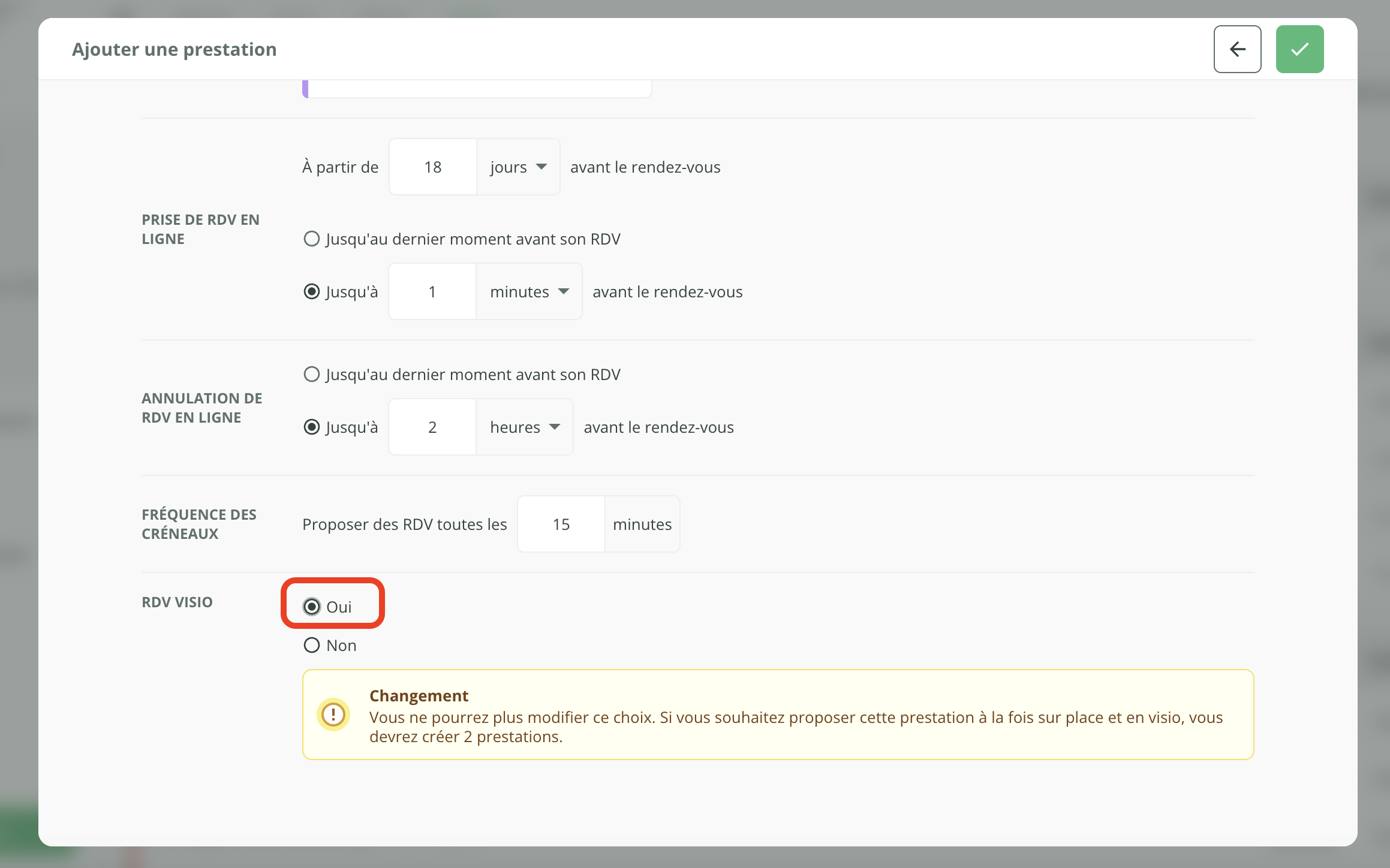 En cas d’erreur, vous devrez supprimer la prestation, en recréer une nouvelle puis cocher Non dans la section "RDV visio".