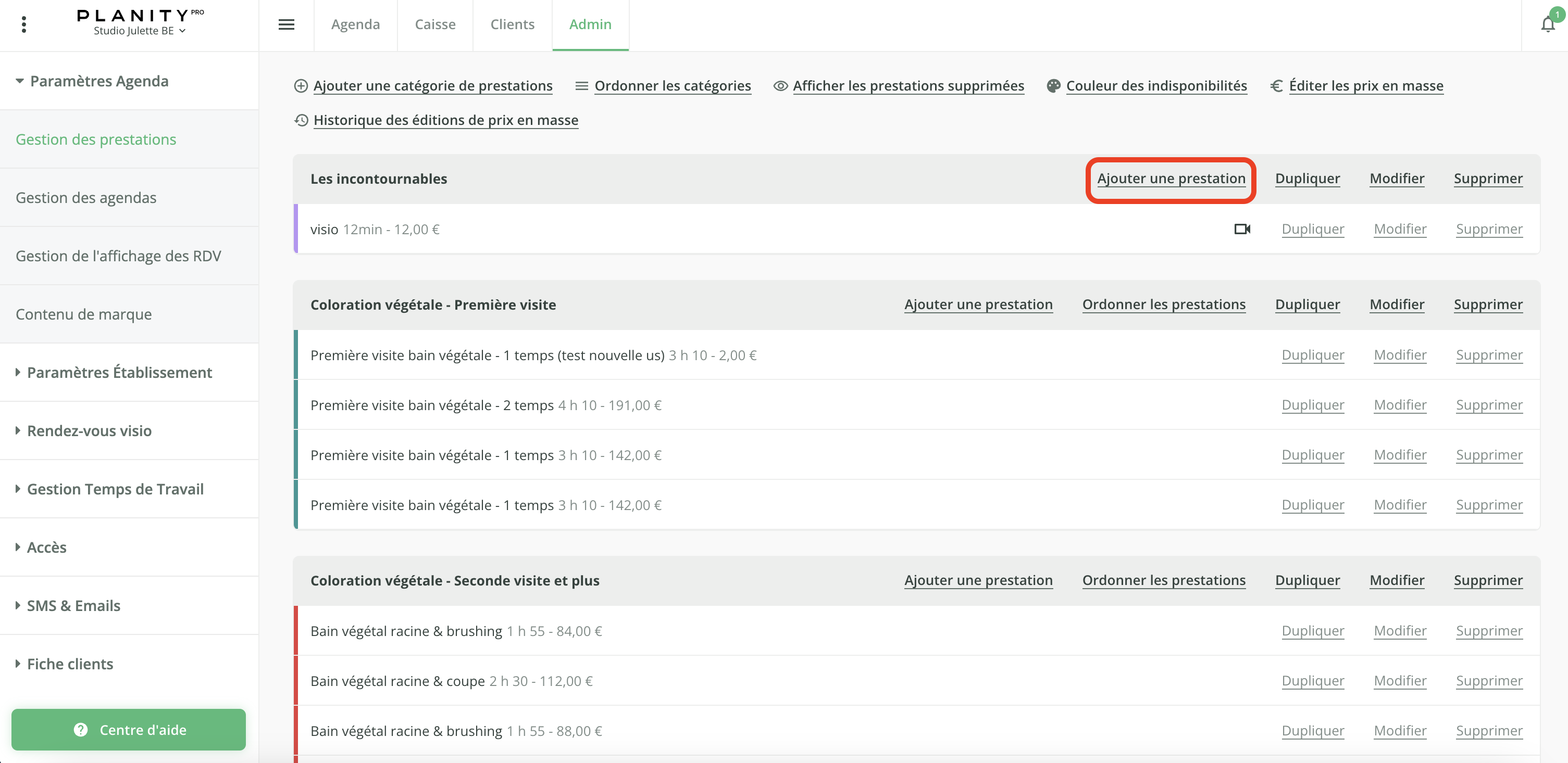Dans la catégorie de votre choix, cliquez sur le bouton Ajouter une prestation.