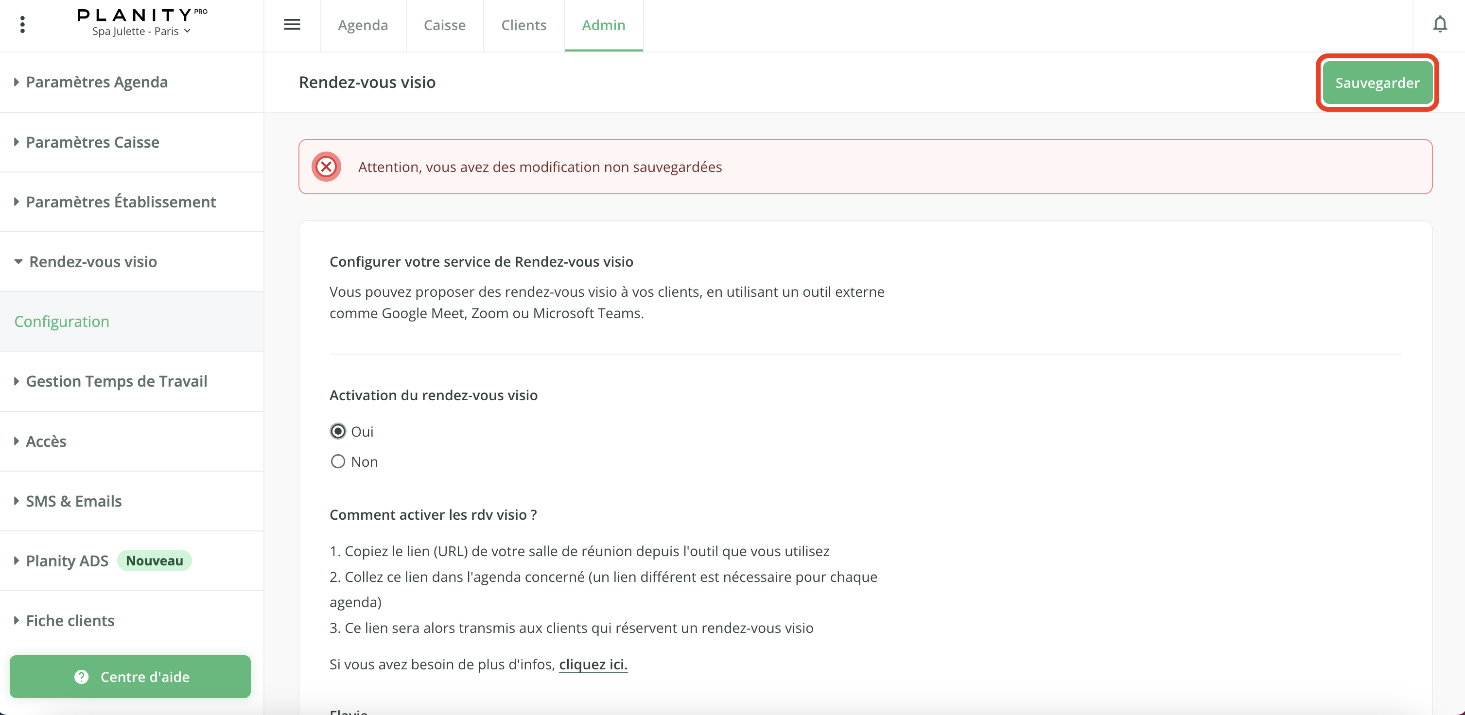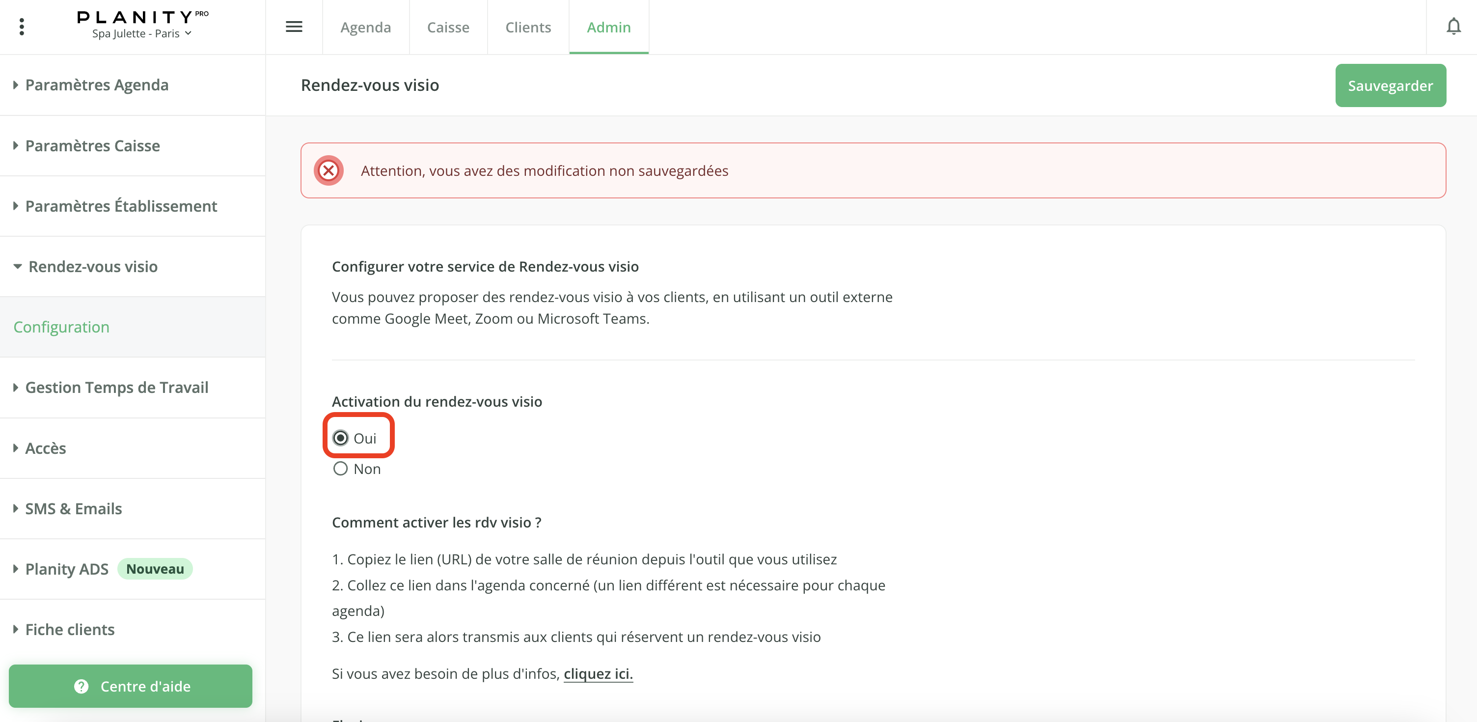 Dans la section "Activation du rendez-vous visio", sélectionnez Oui.