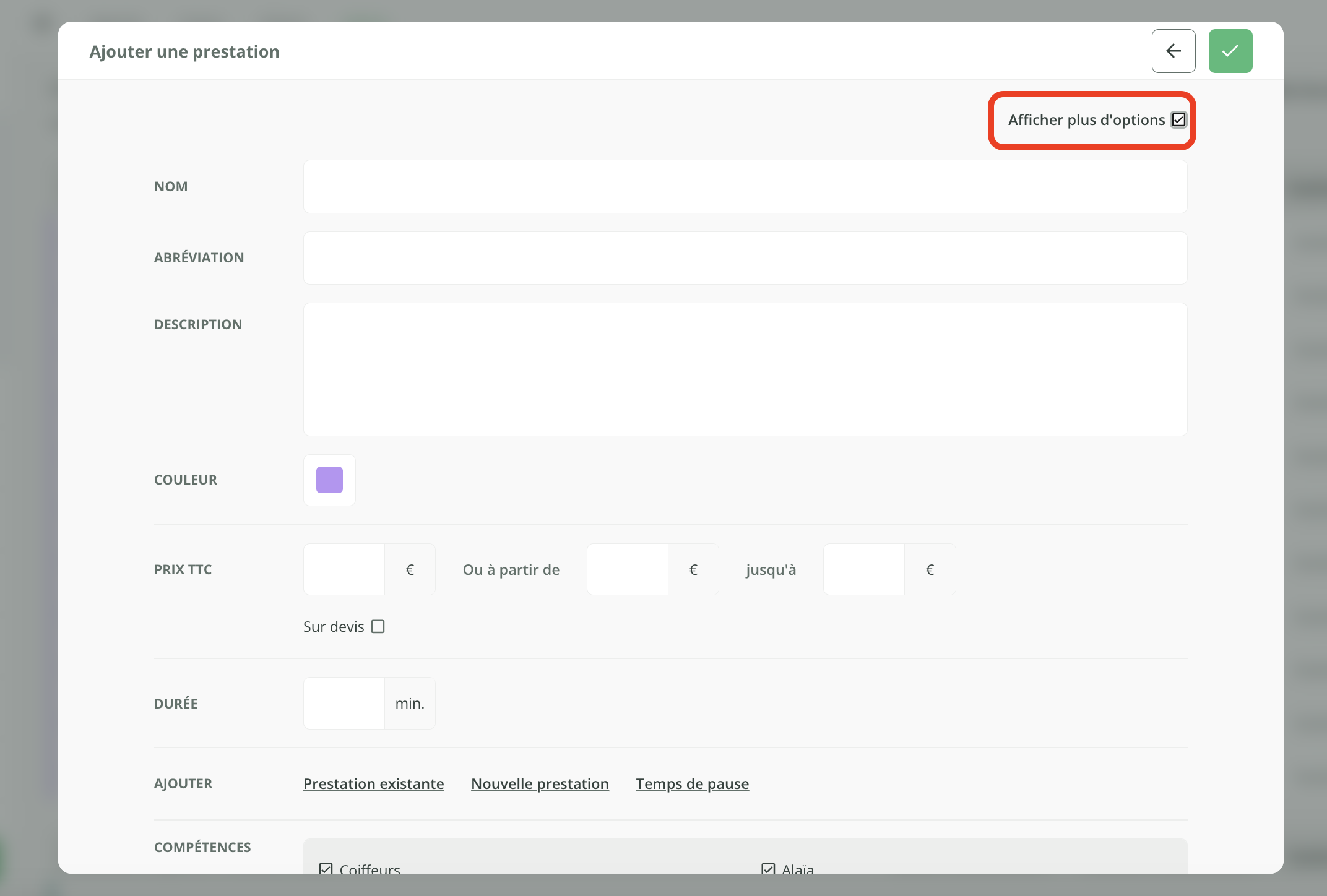 Dans la fenêtre de création de la prestation, cliquez sur Afficher plus d’options en haut à droite.