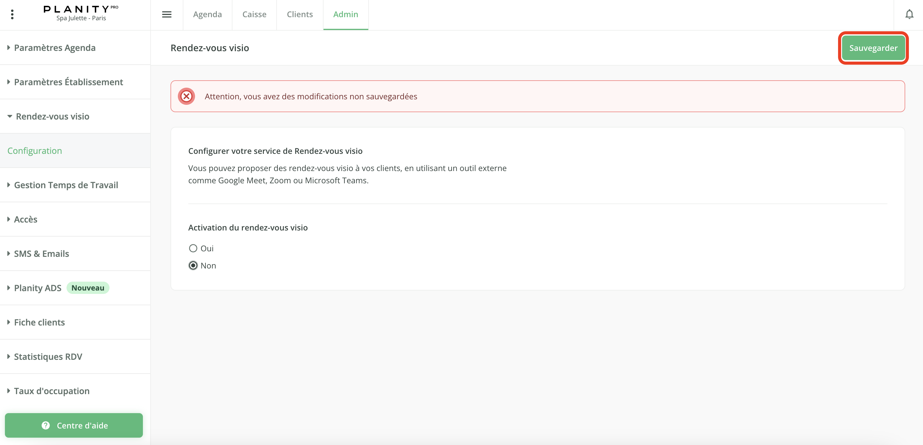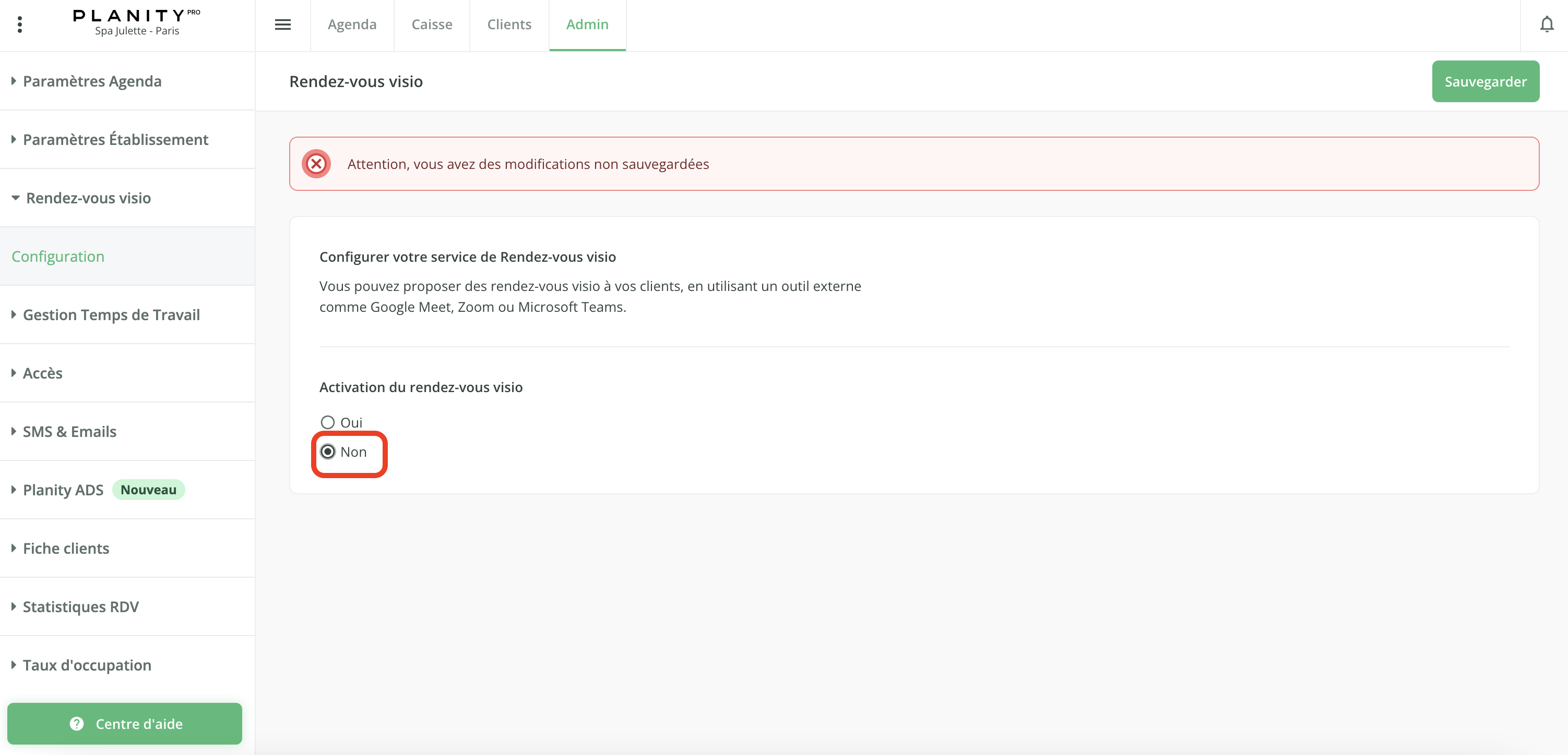 Dans la section "Activation du rendez-vous visio", sélectionnez Non.