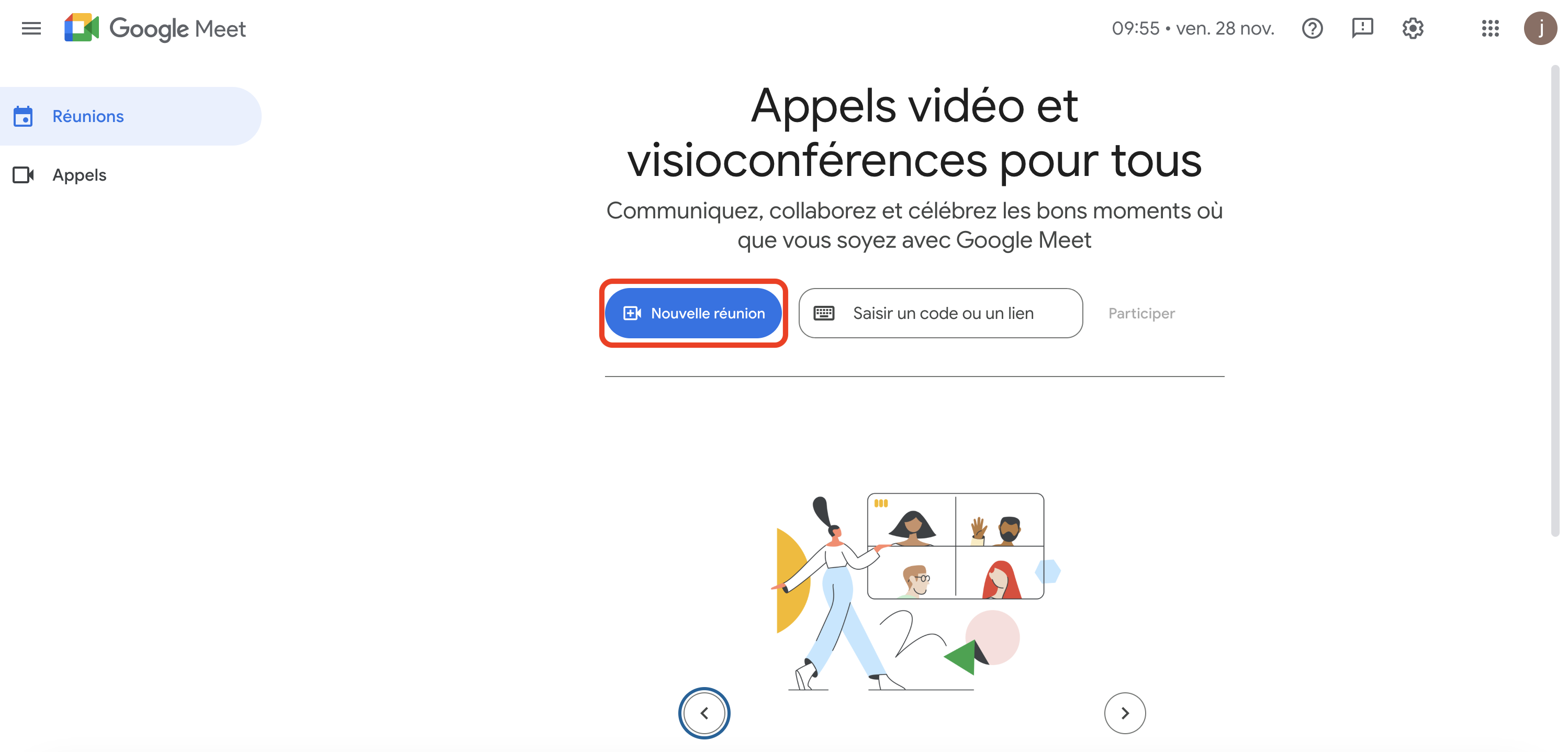 Une fois connecté, cliquez sur le bouton Nouvelle réunion.