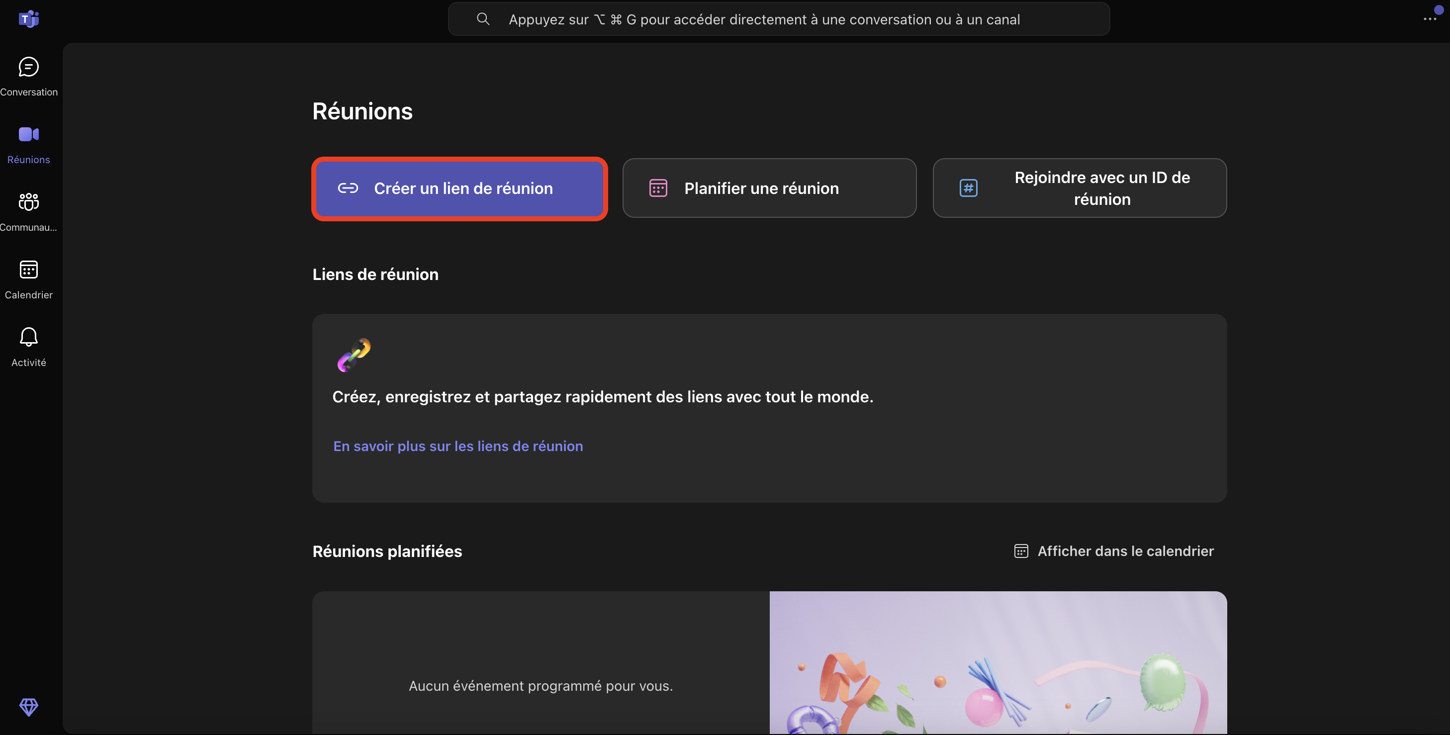 Cliquez ensuite sur le bouton Créer un lien de réunion.