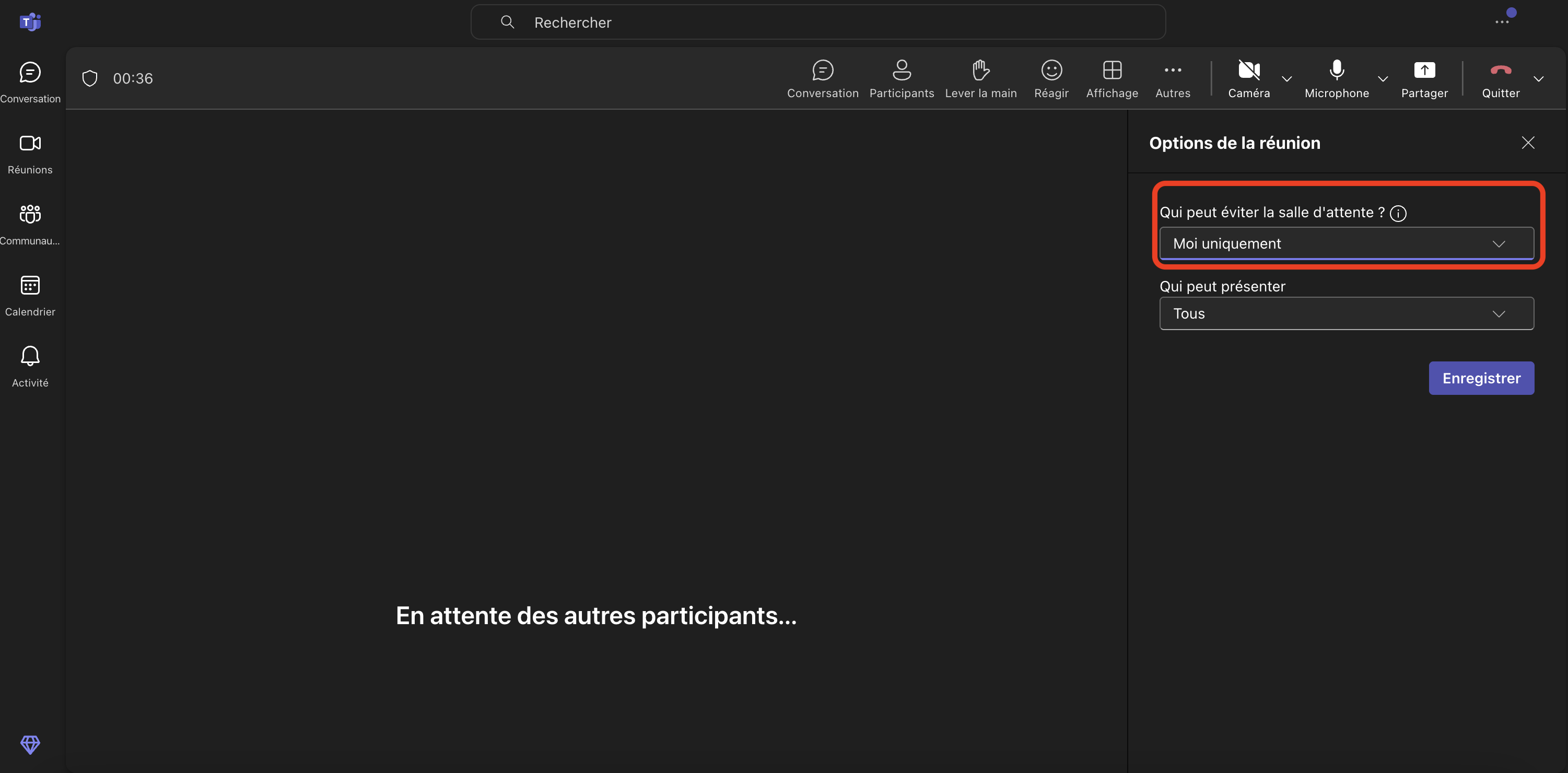 Dans la section "Qui peut éviter la salle d'attente", sélectionnez Moi uniquement.
