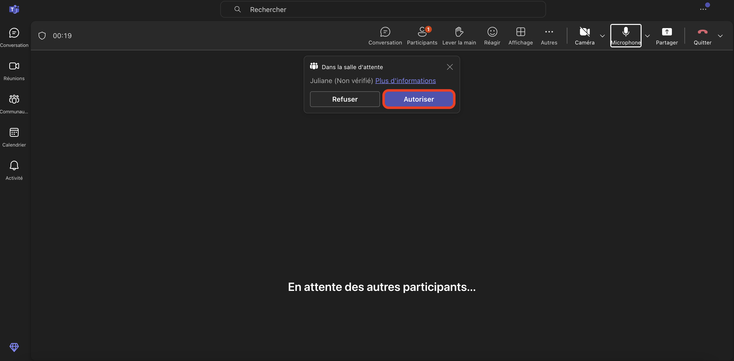 Lorsqu’un client tentera de se connecter, il sera automatiquement placé dans cette salle.Vous devrez alors accepter manuellement sa participation, en cliquant sur Autoriser.