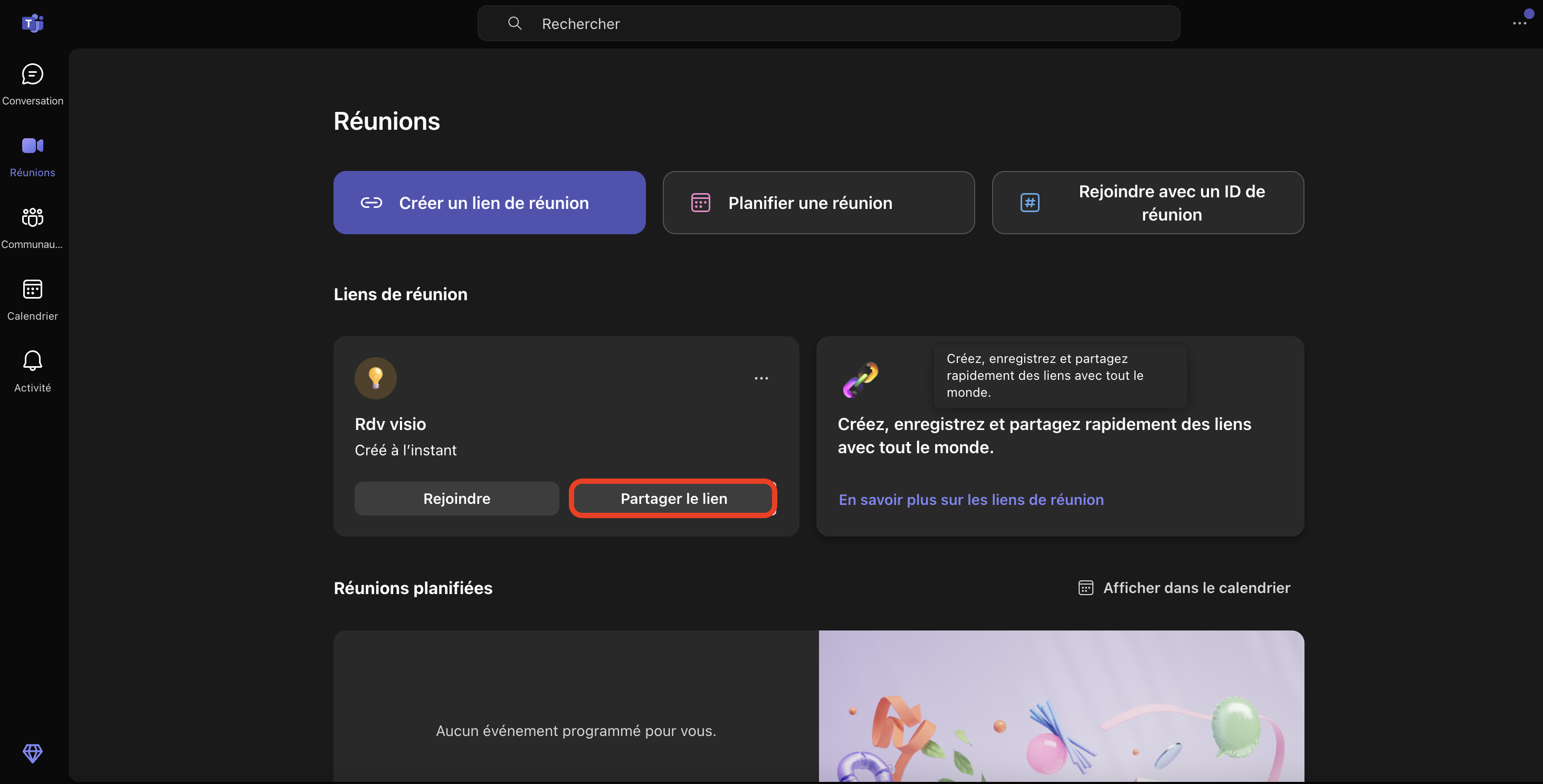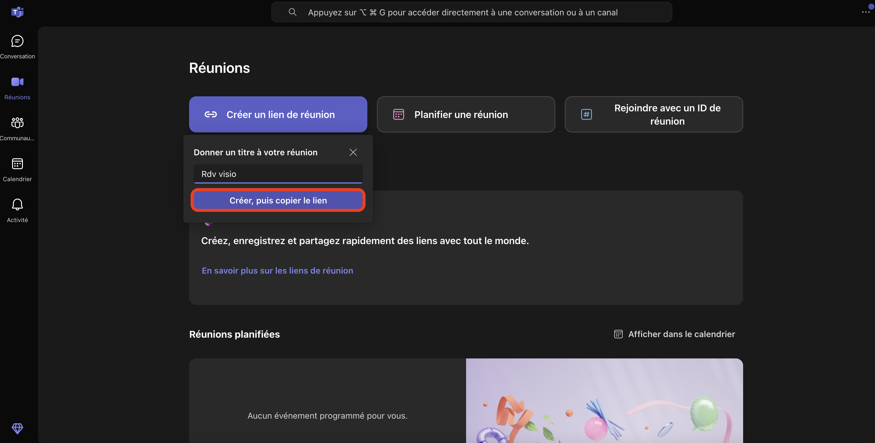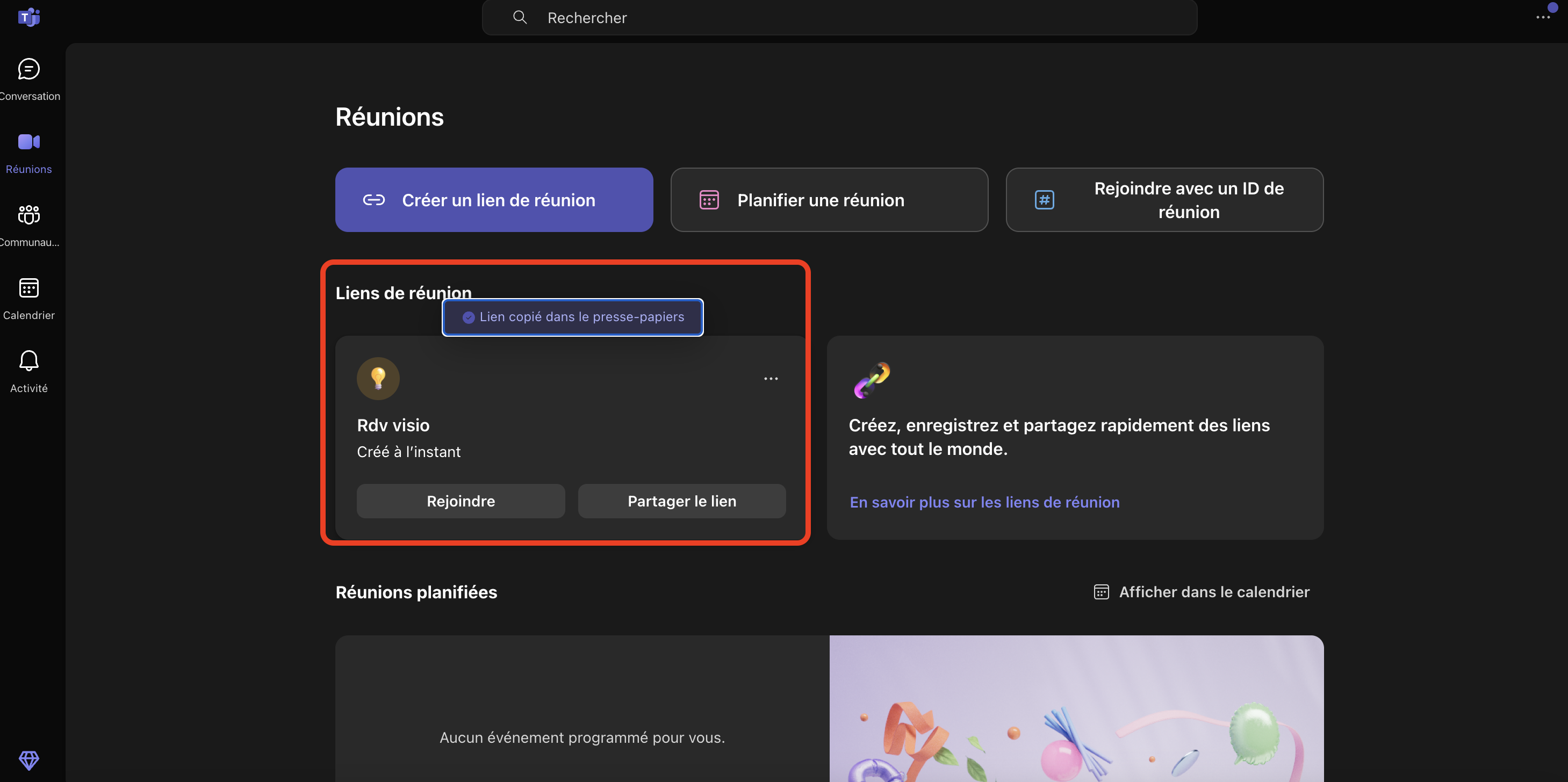 Le lien de votre réunion est alors créé et copié automatiquement.