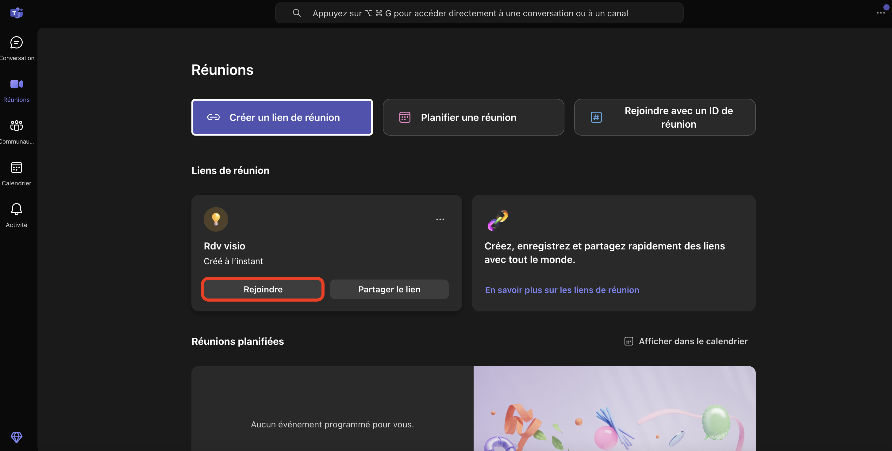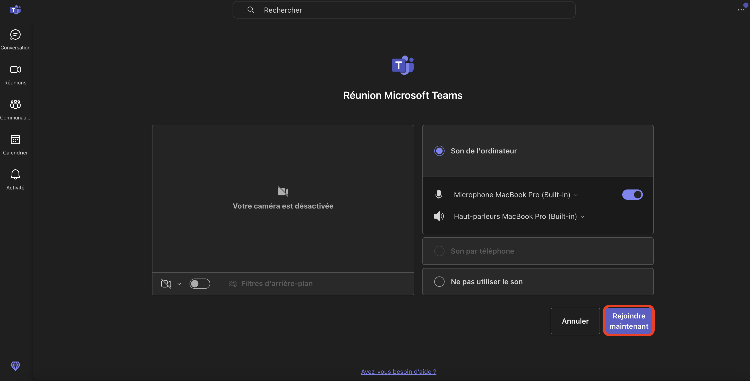 Rendez-vous sur le lien généré par Microsoft Teams en cliquant sur le bouton Rejoindre.