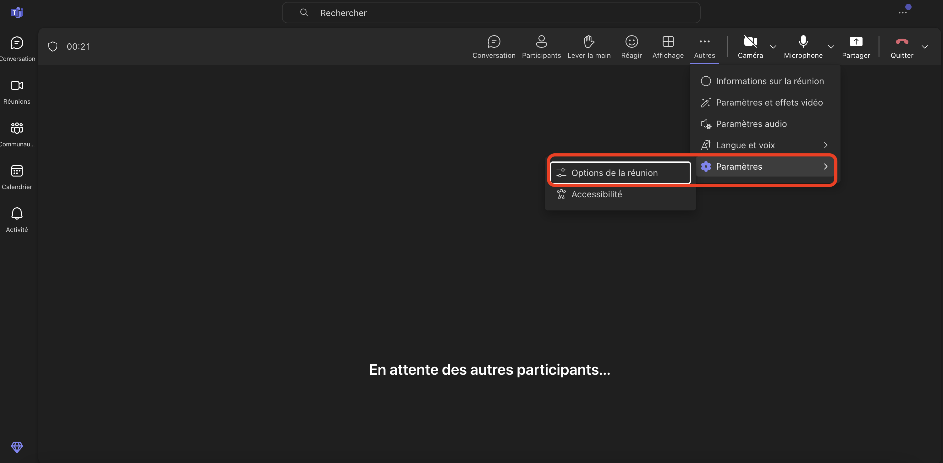 Cliquez ensuite sur Paramètres > Options de la réunion.