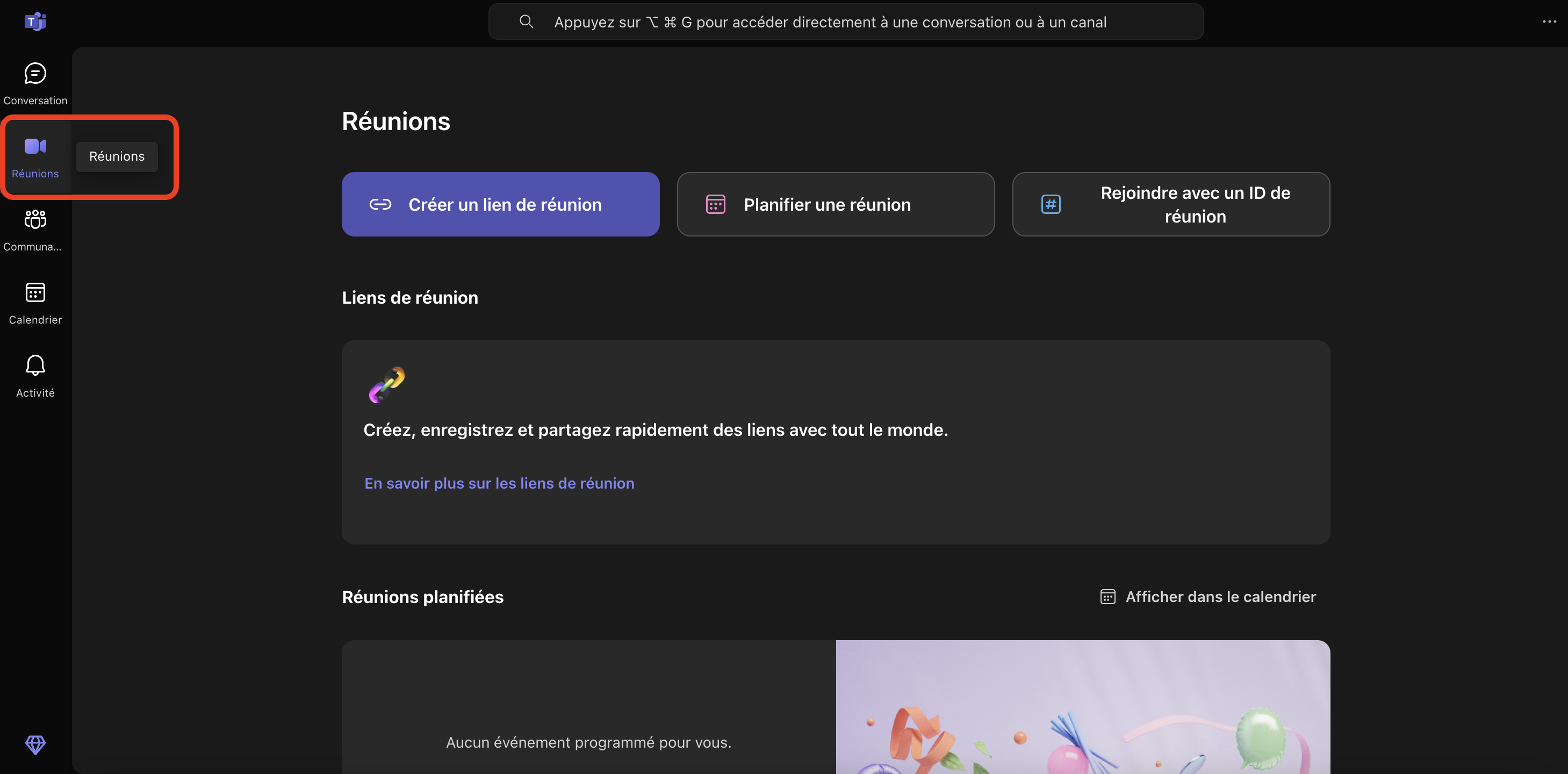 Une fois connecté, cliquez sur l'onglet Réunions.