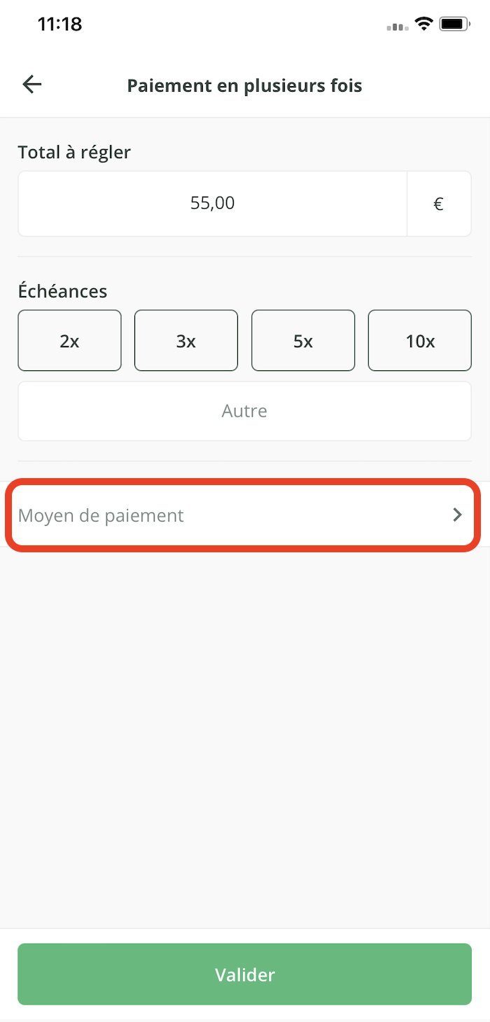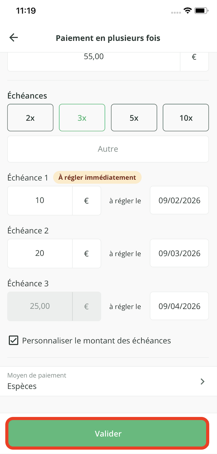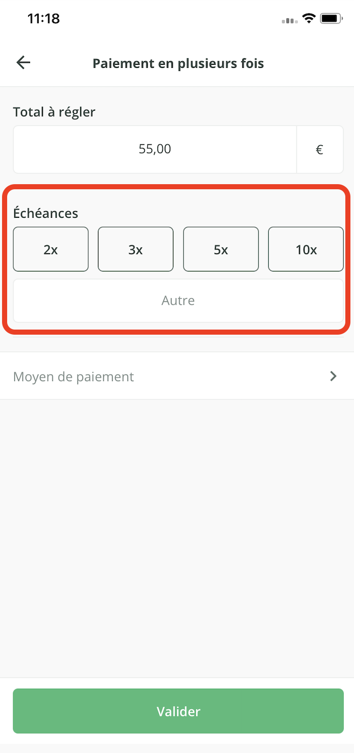 - Une fois le nombre d'échéances paramétré et le moyen de paiement sélectionné, cliquez sur le bouton Valider.