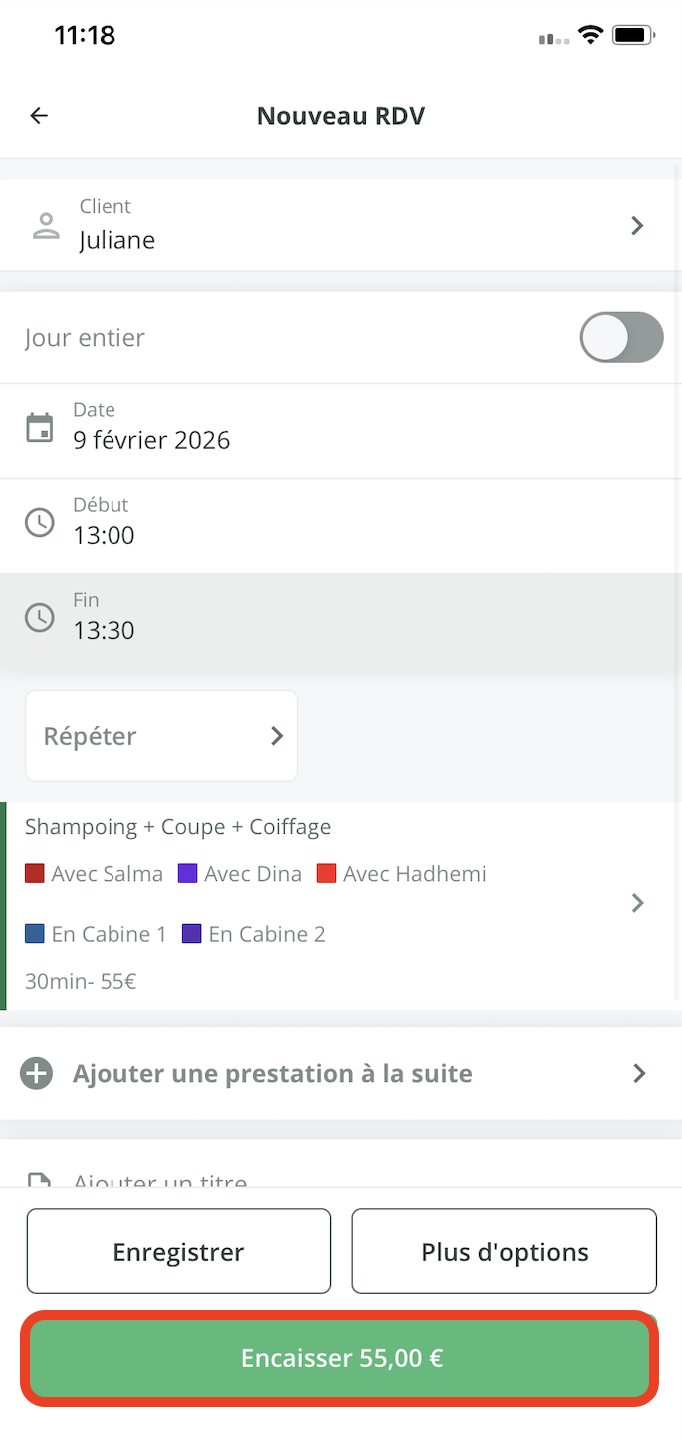 - Cliquez sur le rendez-vous que vous souhaitez encaisser.