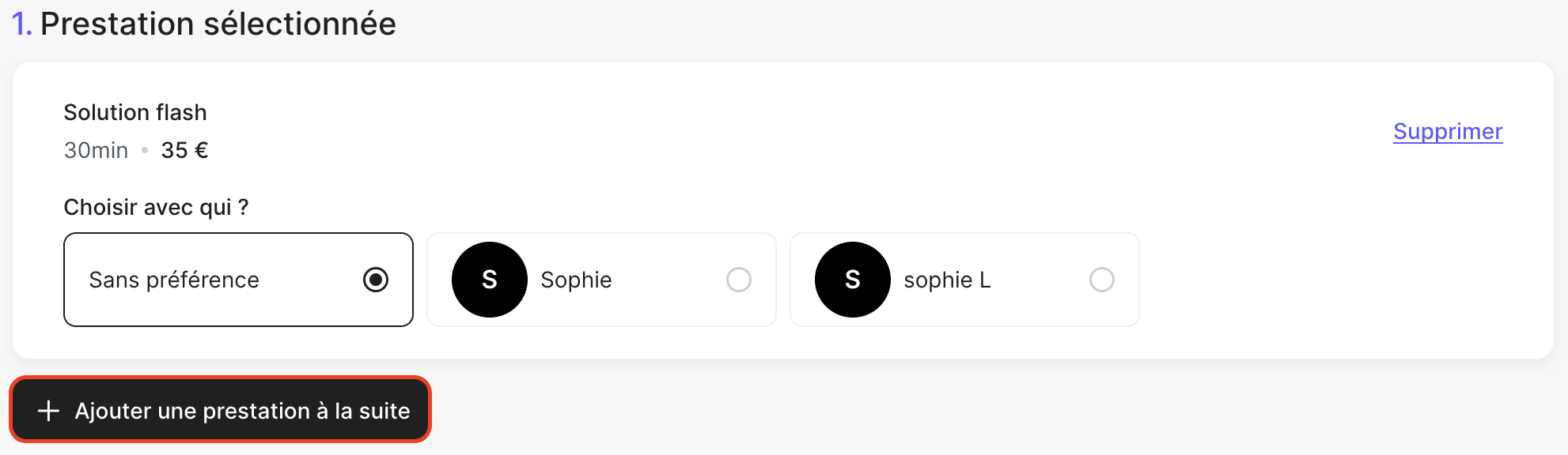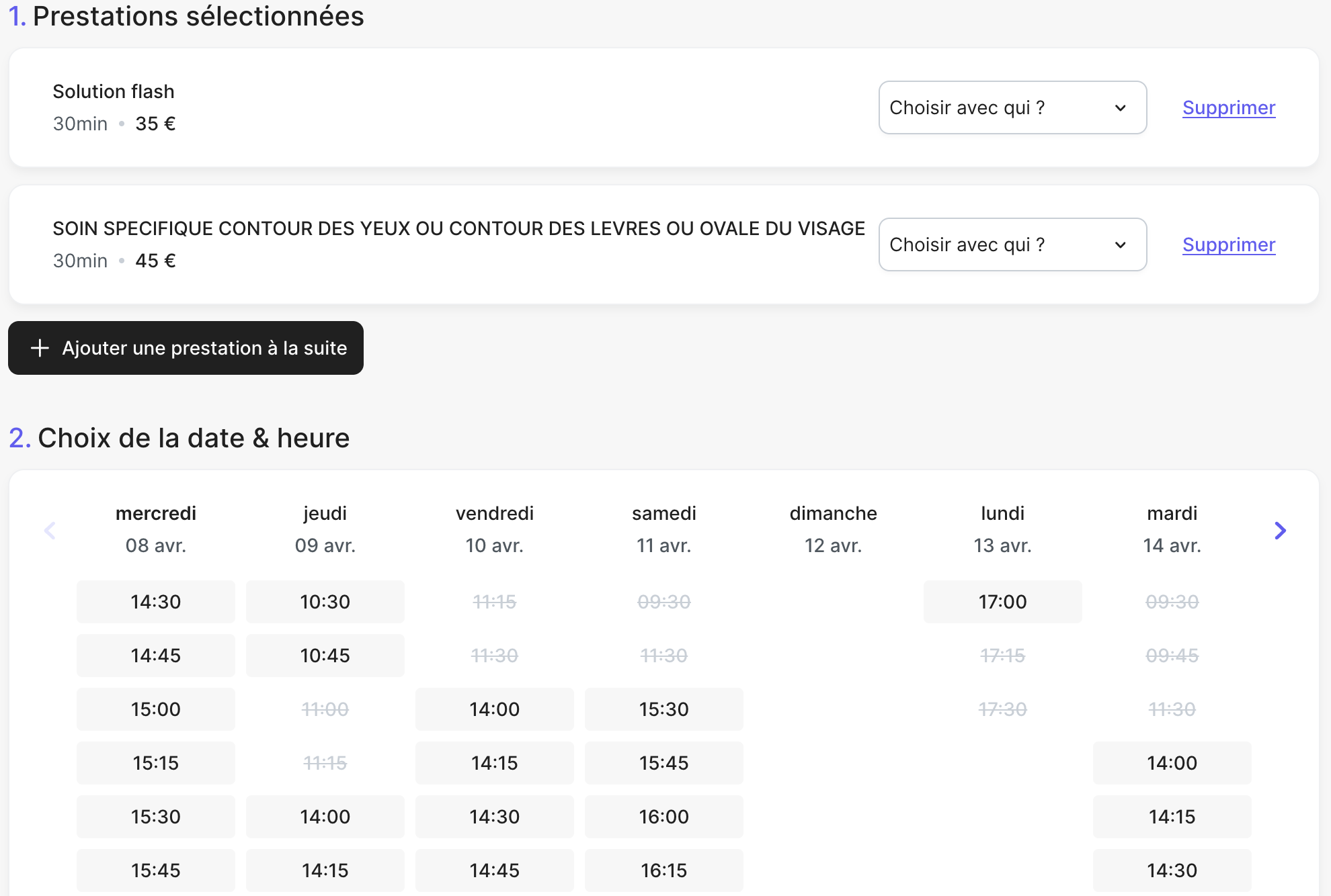 Avant de passer à l’étape de sélection de l’horaire, une option lui est proposée : « Ajouter une prestation à la suite ». Ce bouton lui permet de revenir à la liste des services disponibles afin de compléter sa réservation avec une ou plusieurs prestations supplémentaires.