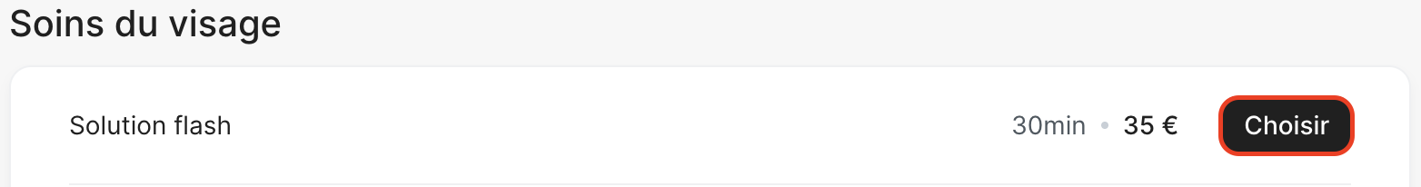 Lorsqu’un utilisateur prend rendez-vous sur la page Planity de votre établissement, il commence par sélectionner une première prestation en cliquant sur le bouton « Choisir »